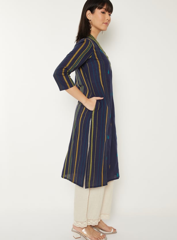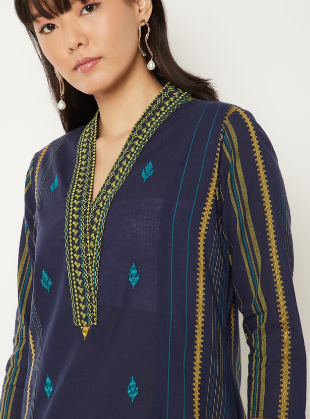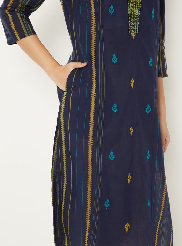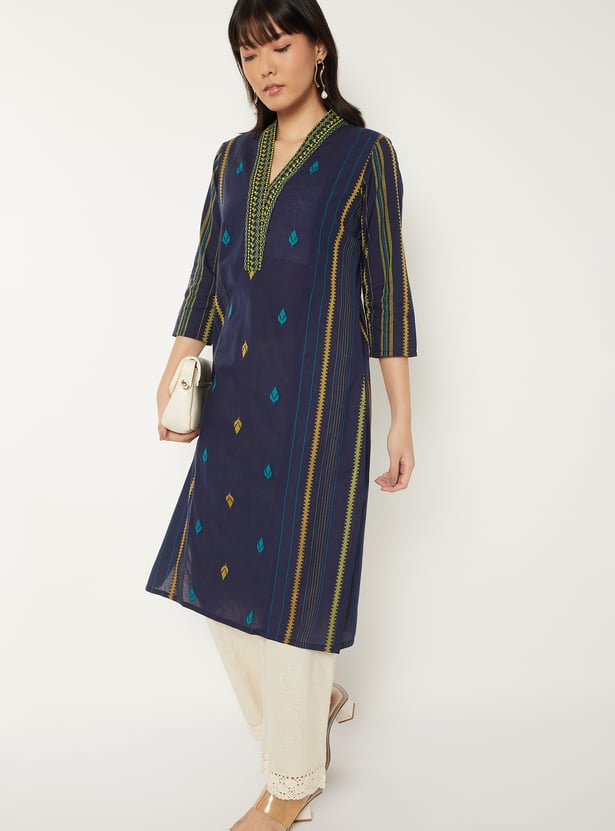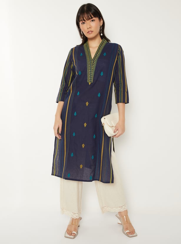Elevate your everyday style with this embroidered straight kurta, featuring a flattering V-neck, 3/4th sleeves, and side slits. Its elegant detailing and classic silhouette make it a versatile choice for both casual and festive wear.
