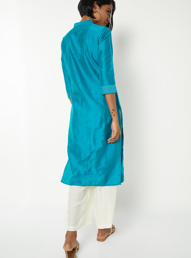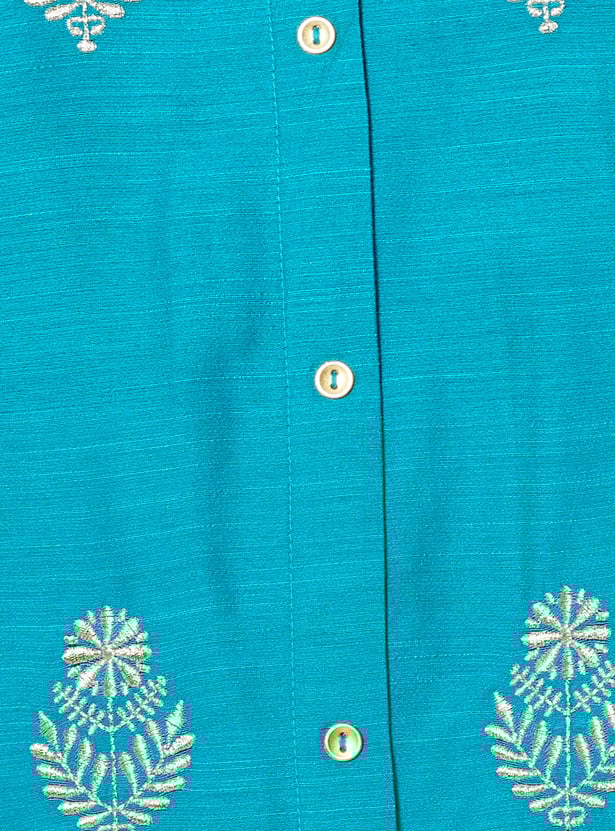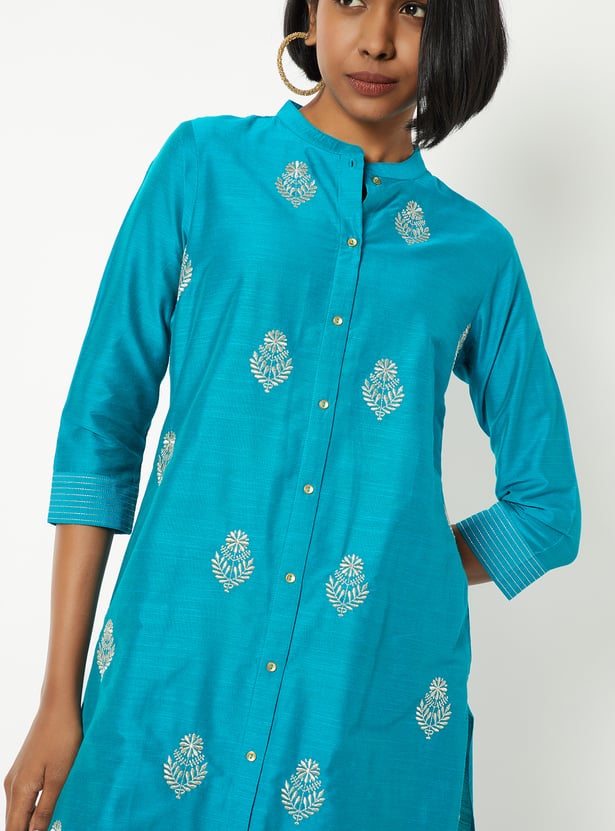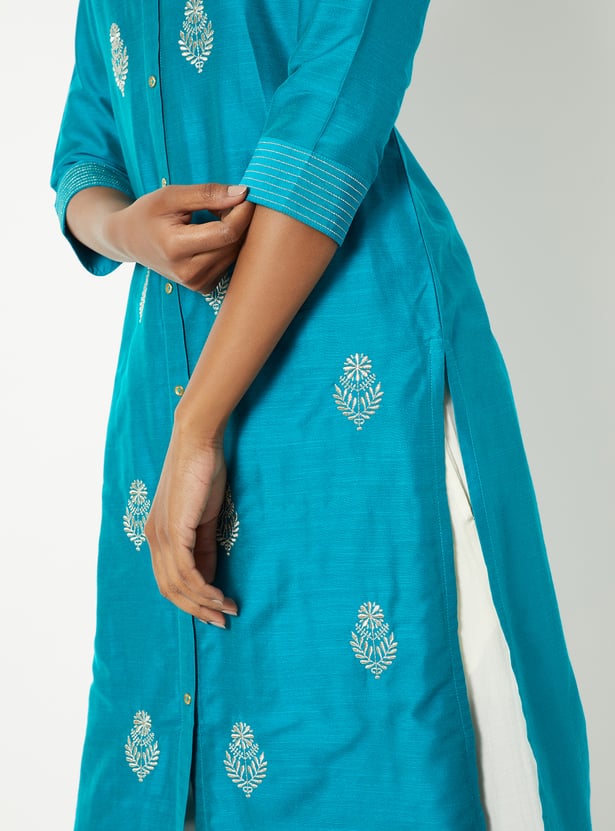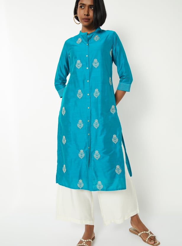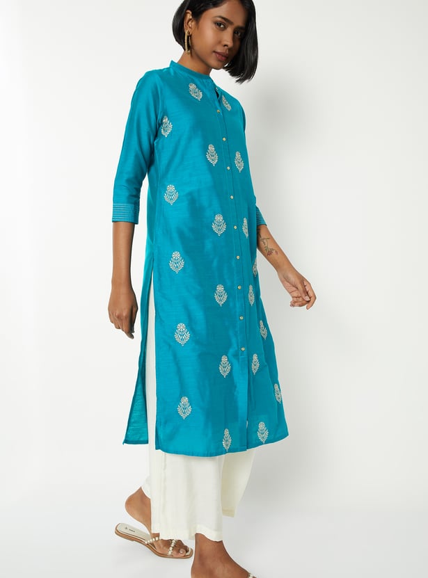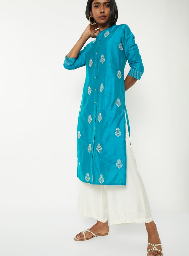 This embroidered straight kurta brings together timeless elegance and modern detailing with its band collar, button-down front, and 3/4th sleeves. The intricate embroidery all over adds texture and charm, making it perfect for both everyday wear and special occasions.
