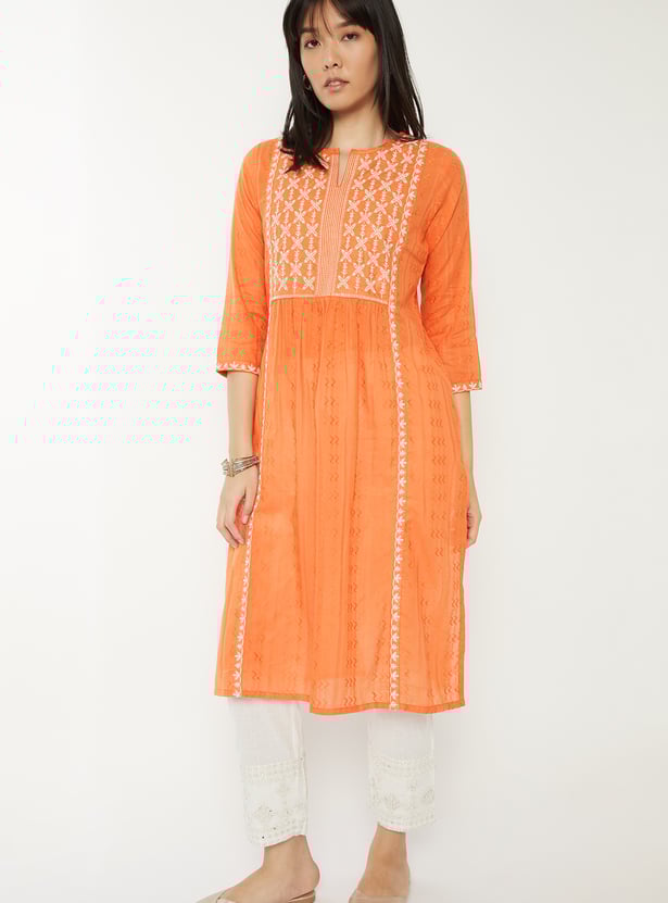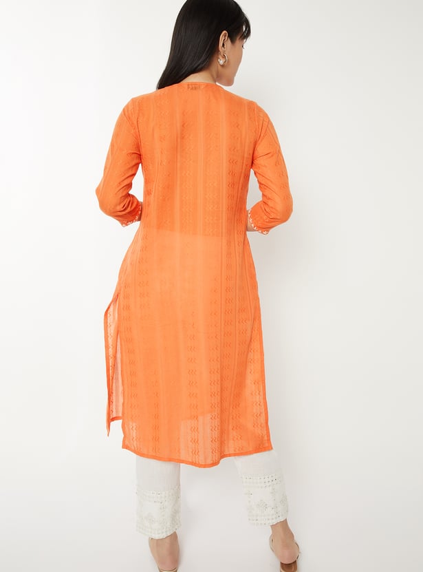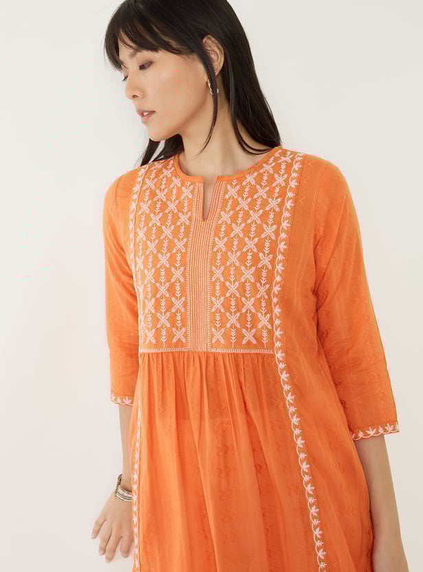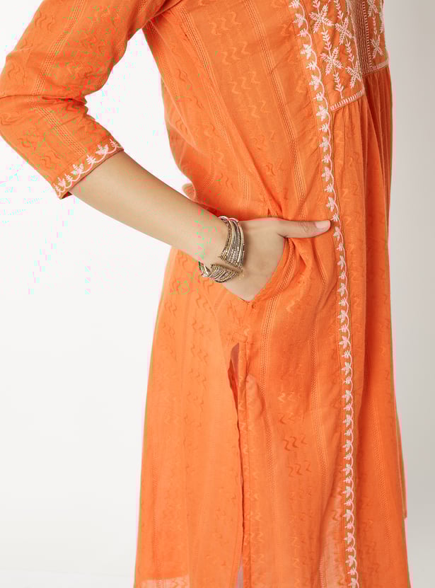 Add a touch of elegance to your everyday wear with this embroidered straight kurta. Featuring a notch neck, 3/4th sleeves, and side slits for ease of movement, it blends comfort with chic design. A practical side pocket adds functionality, making it perfect for both casual outings and daily wear.