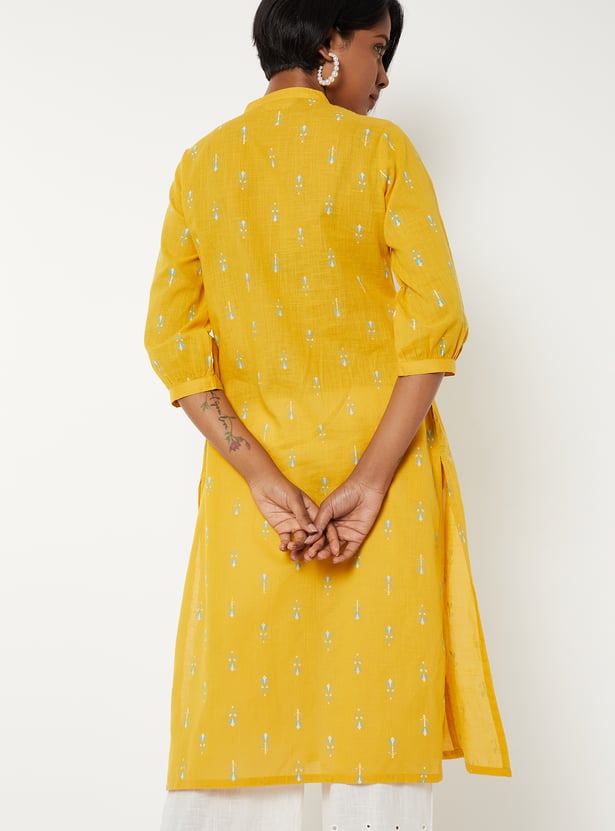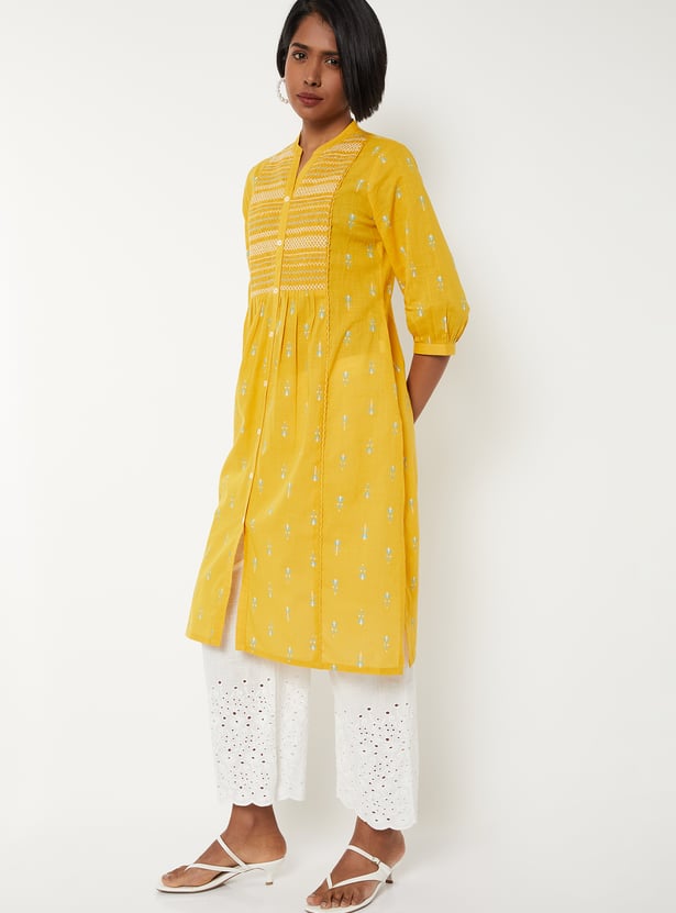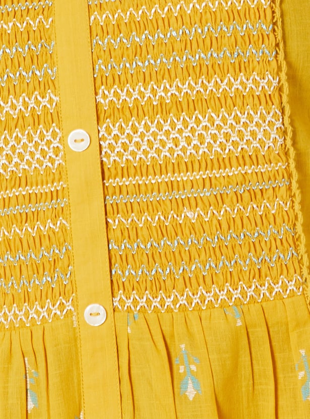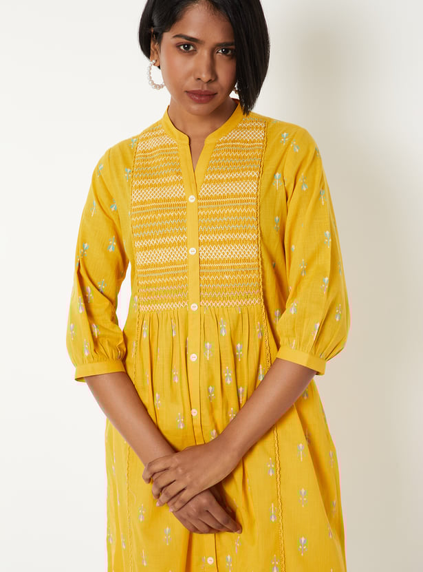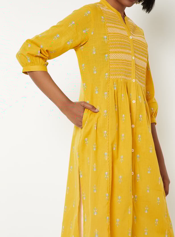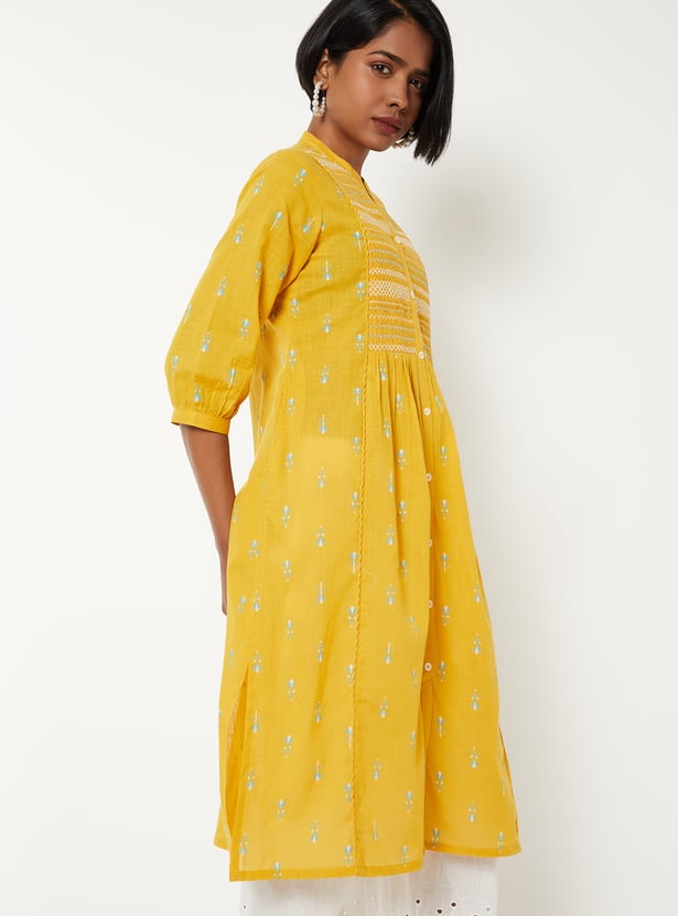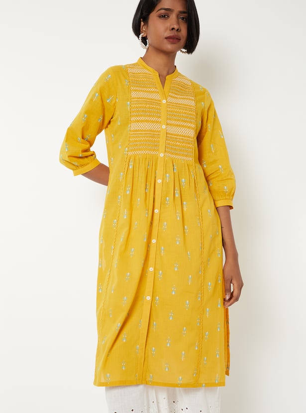 Elegant and detailed, this embroidered straight kurta features smocking on the yoke for added texture. Designed with a band collar and button placket, this piece also features side slits for ease of movement and a practical side pocket, blending style with functionality.