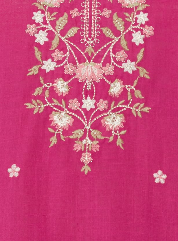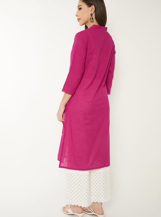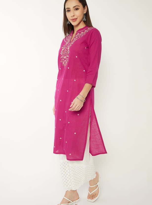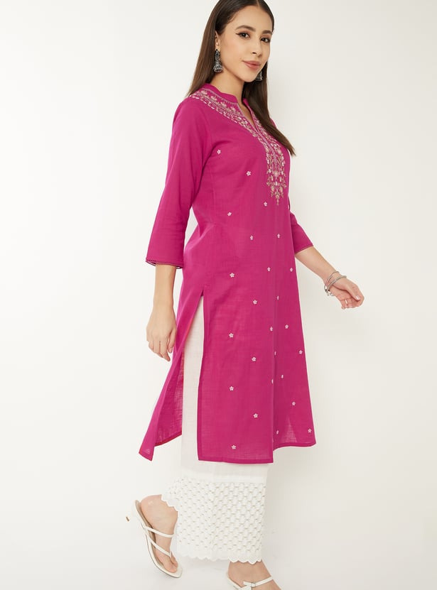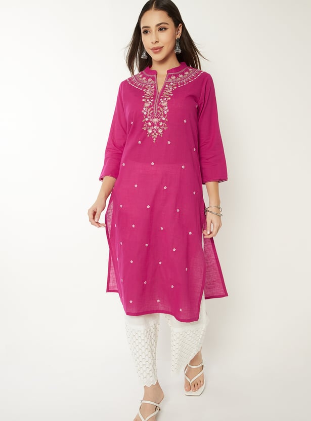 Add graceful charm to your ethnic wardrobe with this embroidered kurta. Featuring yoke embroidery with all-over buti, 3/4th sleeves, band collar, a straight silhouette, and a side pocket.