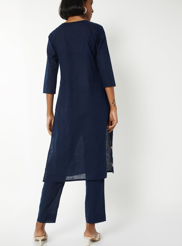 Step out in graceful style with this sequins embroidered straight kurta set. The kurta is designed with a flattering round neck, 3/4th sleeves, and side slits for ease. It comes paired with straight pants featuring an elasticated waist for all-day comfort.