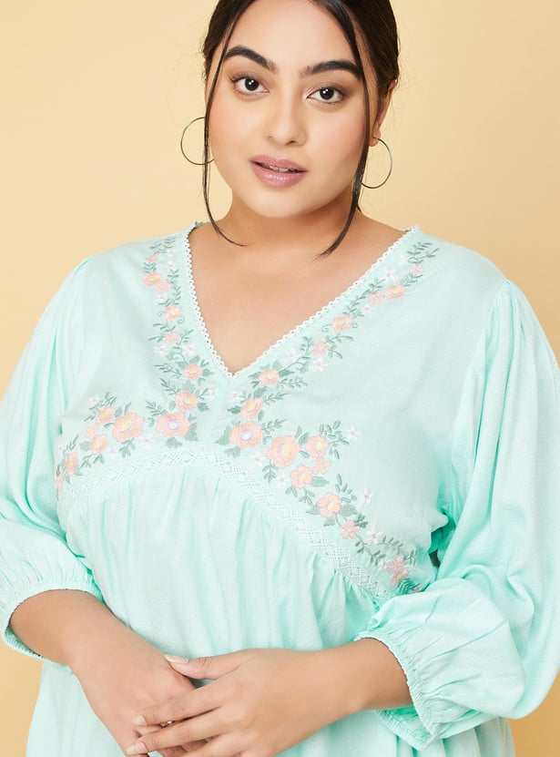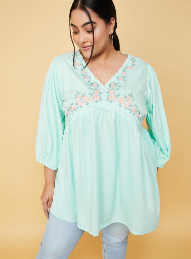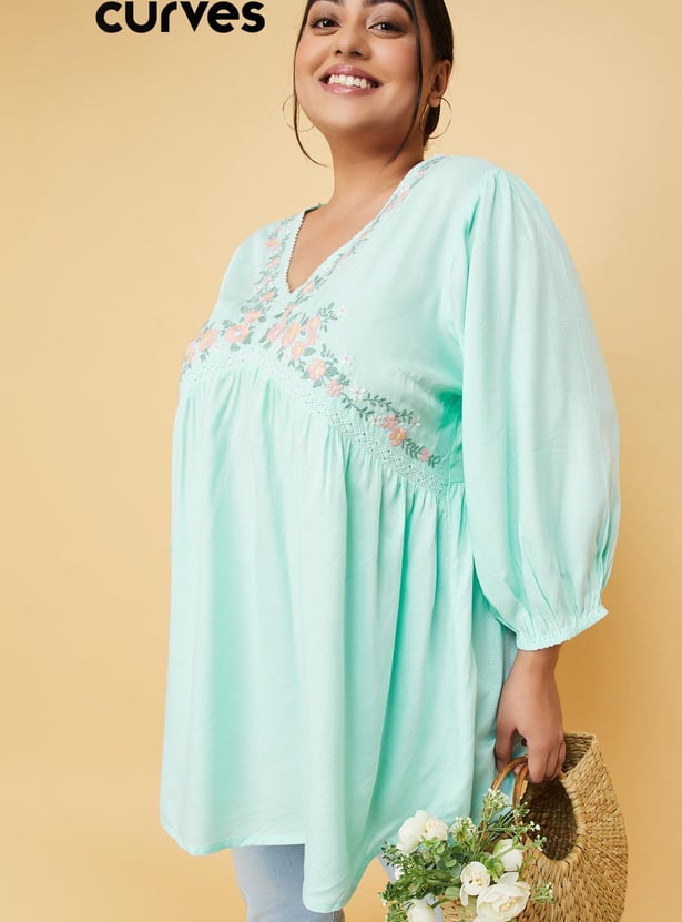 Breeze through the day in style with this tunic. It features three-quarter sleeves, a V-neckline, an empire waist with gathering details, and a flared hemline. The intricate floral patterns at the yoke create a harmonious blend of elegance and charm. Model Size :