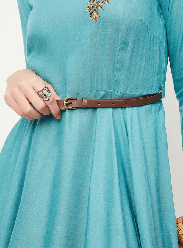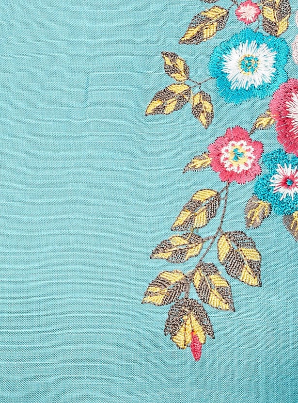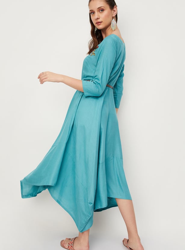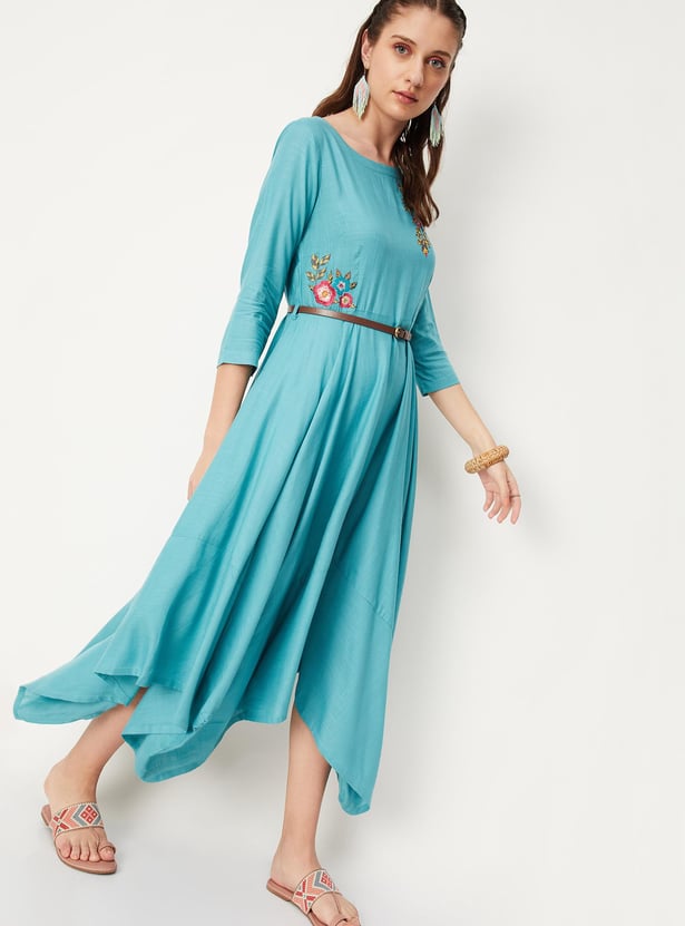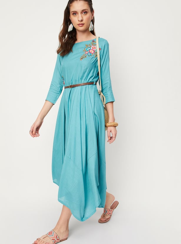 Step into spring in style in this midi-length dress with floral embroidery. It is designed with a round neck, three-quarter sleeves, belted waist, and a waterfall hem. Style this dress with flat sandals to complete the look.