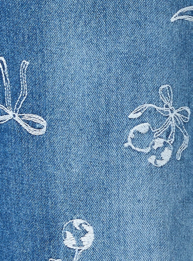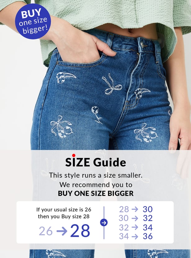 Flaunt your chic style with these washed-finish jeans, designed with an all-over embroidered design for a touch of personality. Featuring a belt loop waist, five pockets, and a wide-leg profile, they seamlessly blend comfort with fashion.