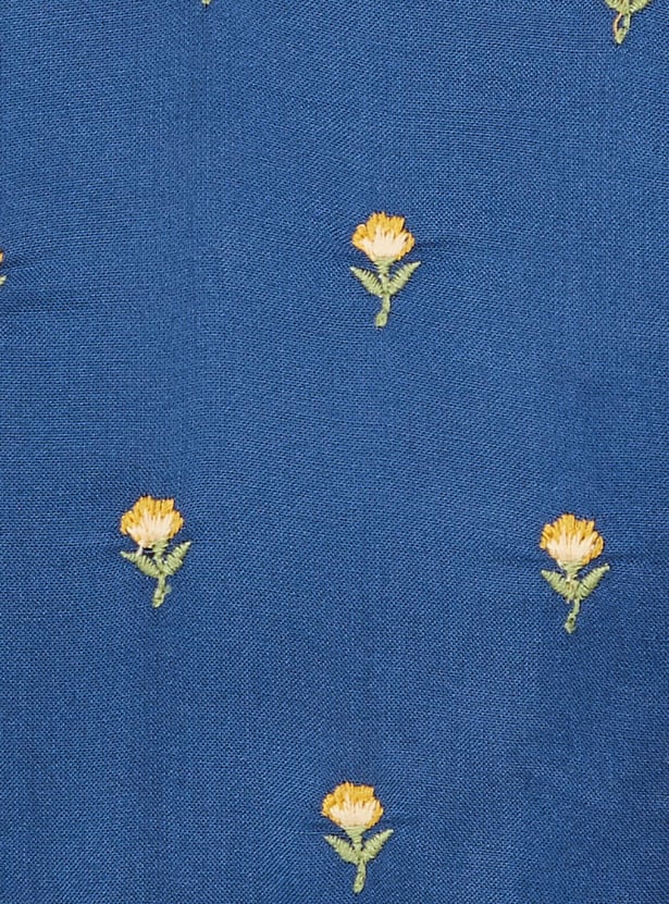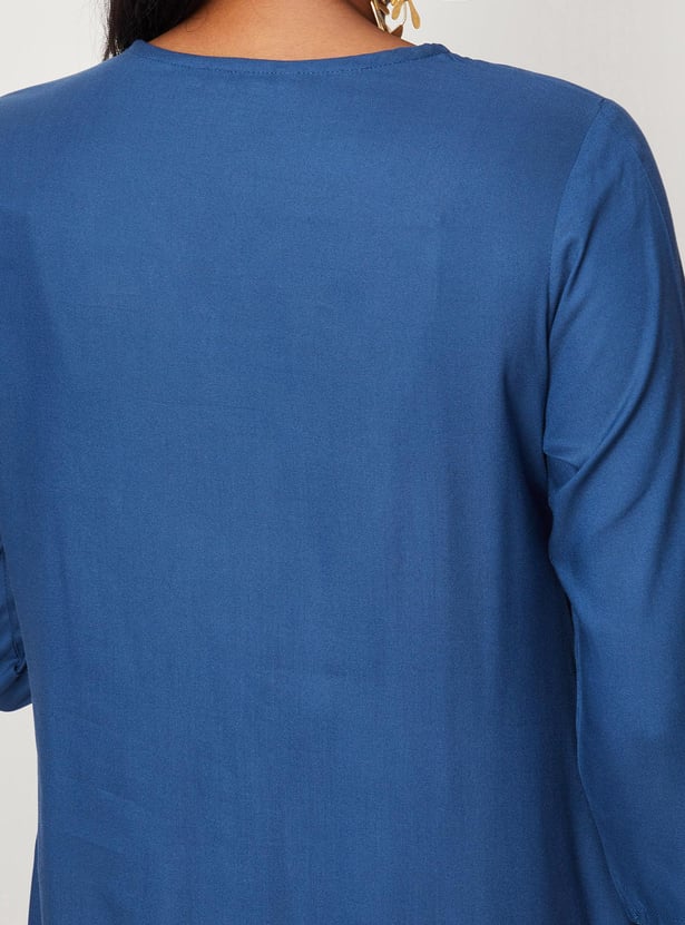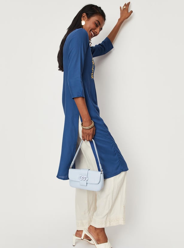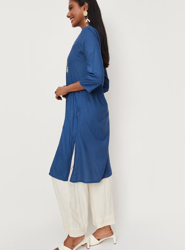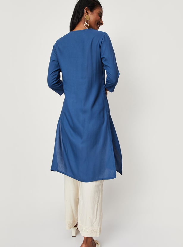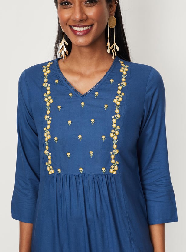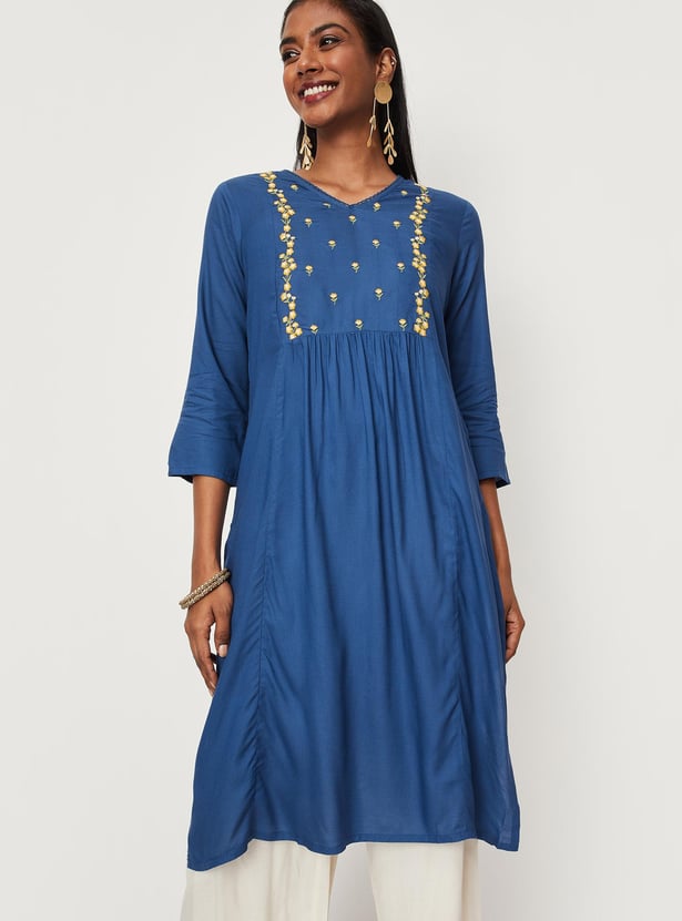 Fill your wardrobe with a flattering ethnic collection. This a-line kurta is designed with an embroidered yoke, a v-neck, three-quarter sleeves, and knee-length construction. Team this kurta with a pair of palazzos and heels to make your outfit look complete and elegant.