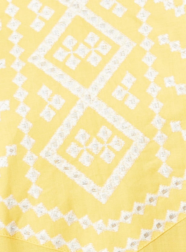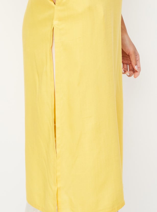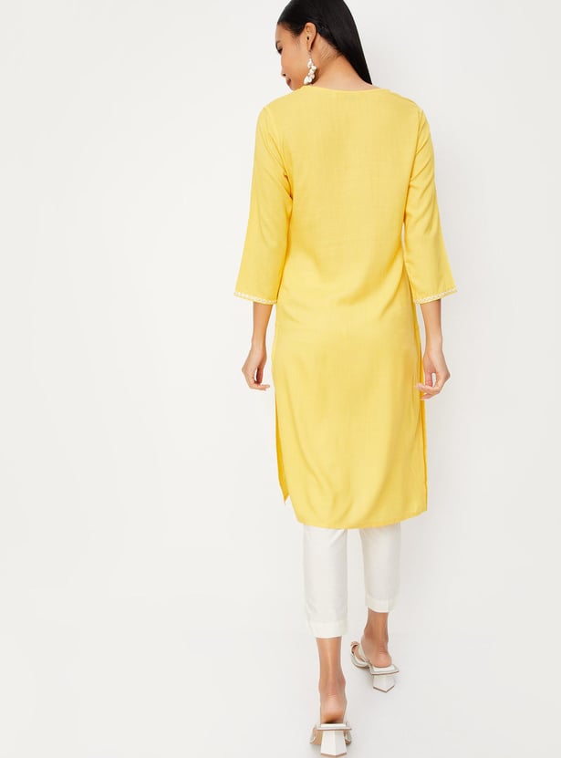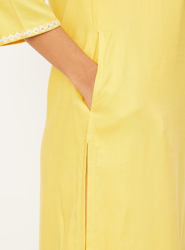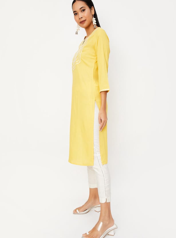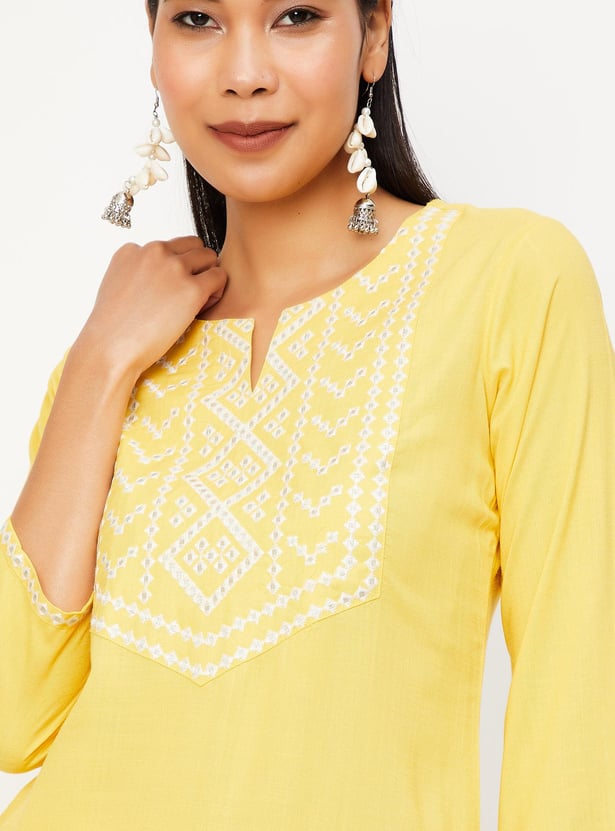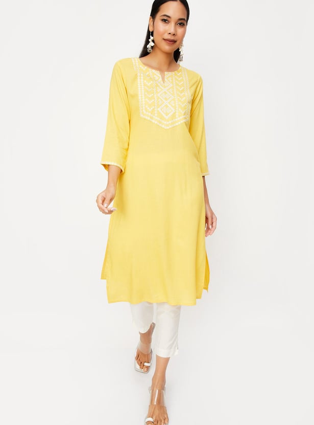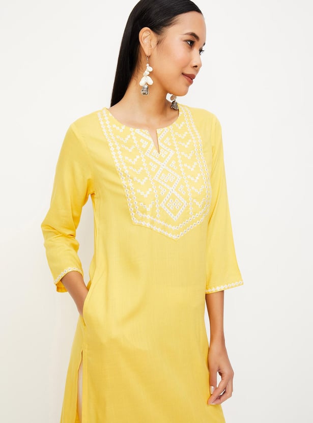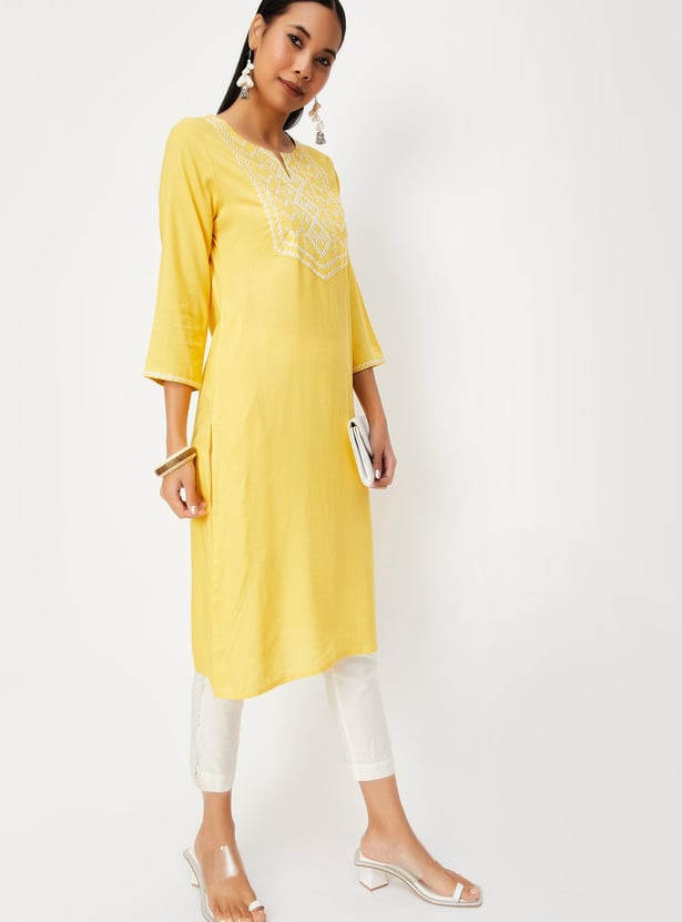 Create an effortless look with this straight kurta. It has three-quarter sleeves and a notched neckline with an embroidered yoke and pocket. To get an elegant look, wear this kurta with a pair of leggings and sandals.