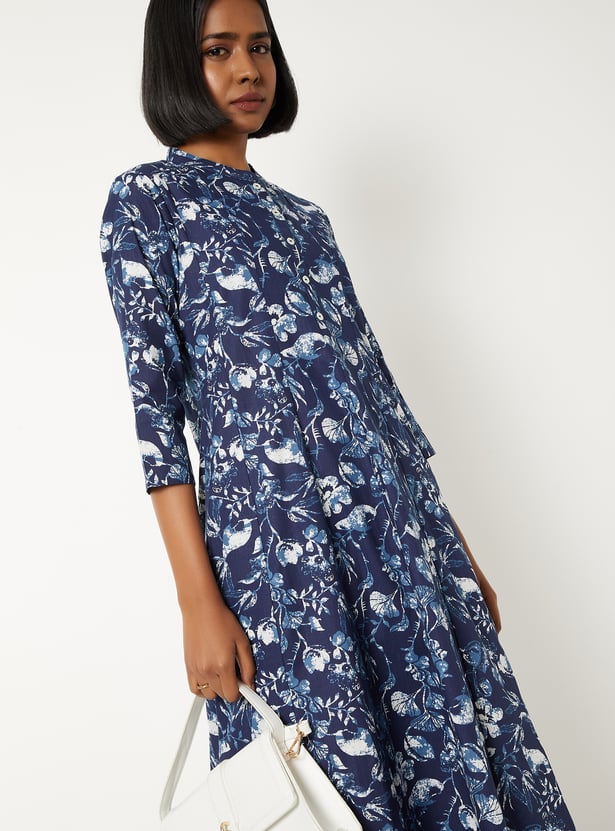 Embrace effortless elegance with this floral print A-line kurta set. The kurta boasts a band collar, button placket, and 3/4th sleeves, offering a flattering silhouette. Paired with these straight pants with an elasticated waist, this set ensures both comfort and style for any occasion.