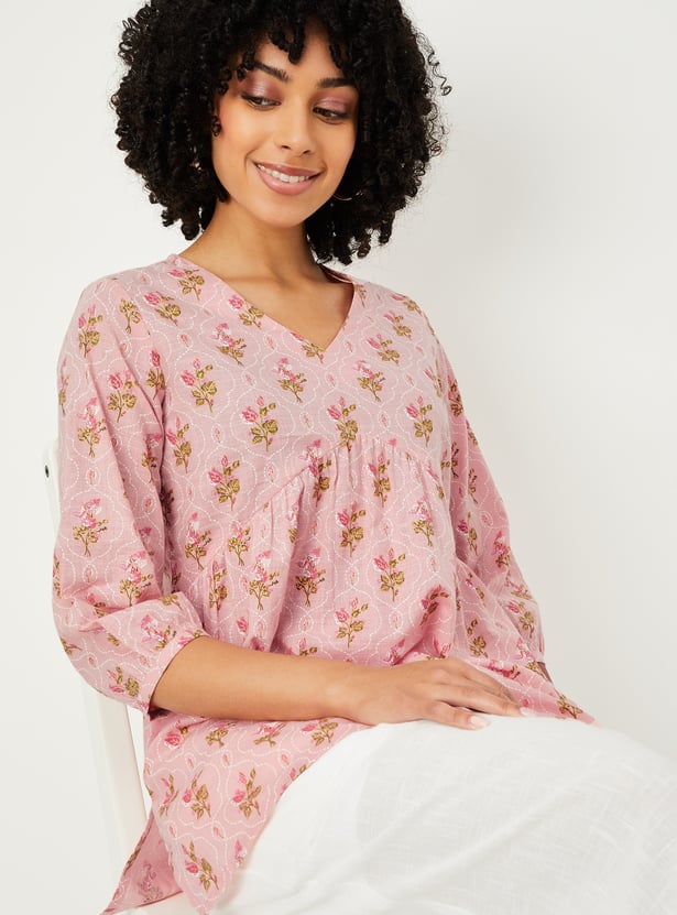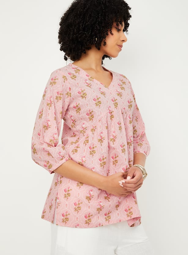 Step into effortless elegance with this floral print A-line kurti that blends comfort with charm. Featuring a flattering V-neck, 3/4th sleeves, and a short length, it adds a refreshing twist to your everyday ethnic wear.