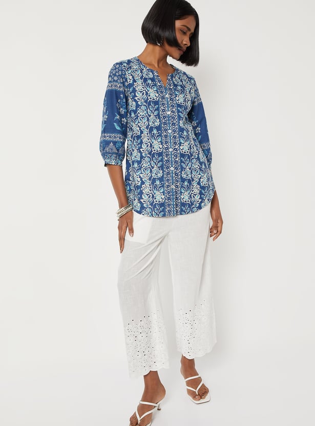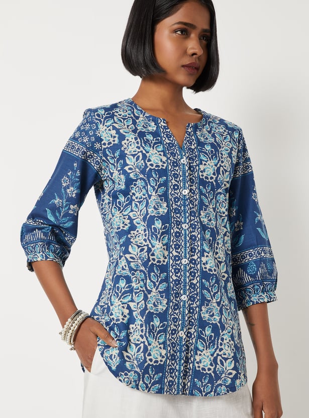 Brighten up your everyday look with this charming floral print kurti. Styled with a notch neck and 3/4th sleeves, it brings a touch of casual elegance to your outfit. The short length and curved hem offer a flattering, easy-to-wear silhouette. Finished with a shirt-style placket, it blends traditional comfort with modern appeal.
