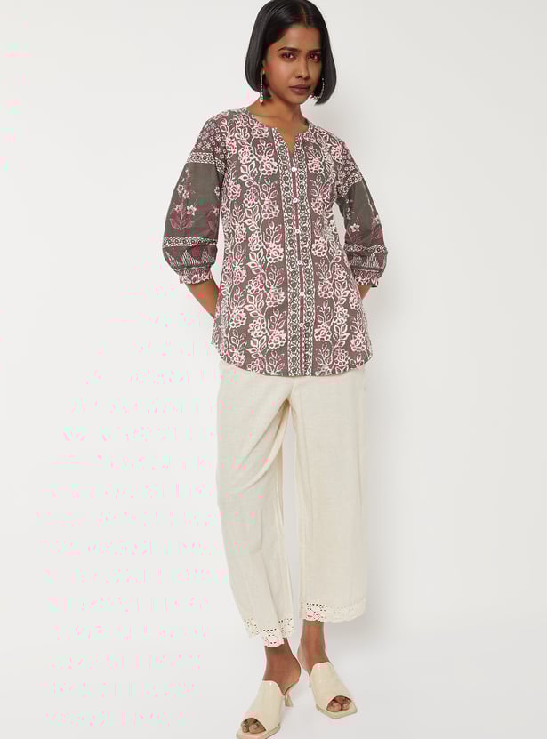 Brighten up your everyday look with this charming floral print kurti. Styled with a notch neck and 3/4th sleeves, it brings a touch of casual elegance to your outfit. The short length and curved hem offer a flattering, easy-to-wear silhouette. Finished with a shirt-style placket, it blends traditional comfort with modern appeal.