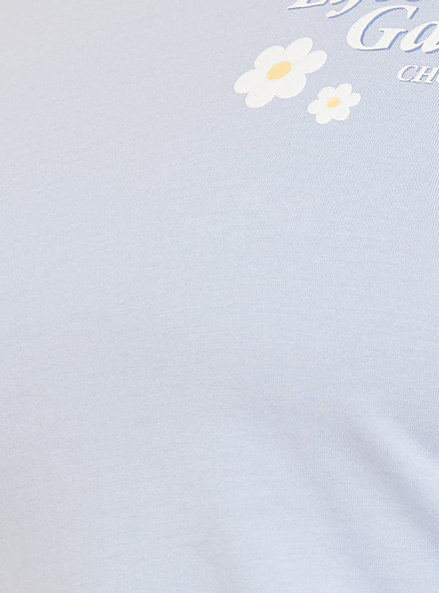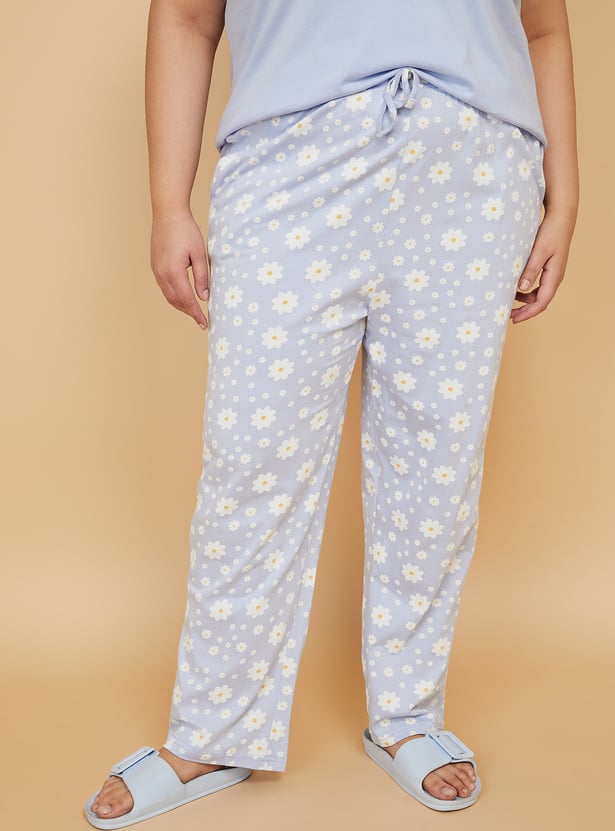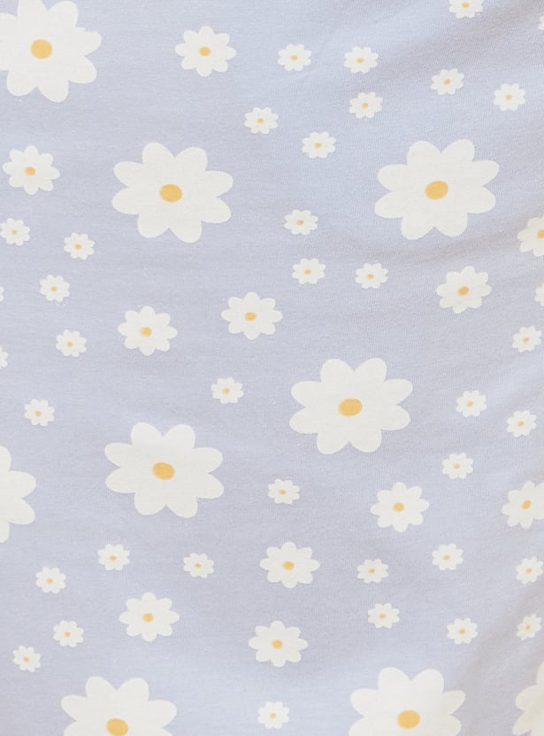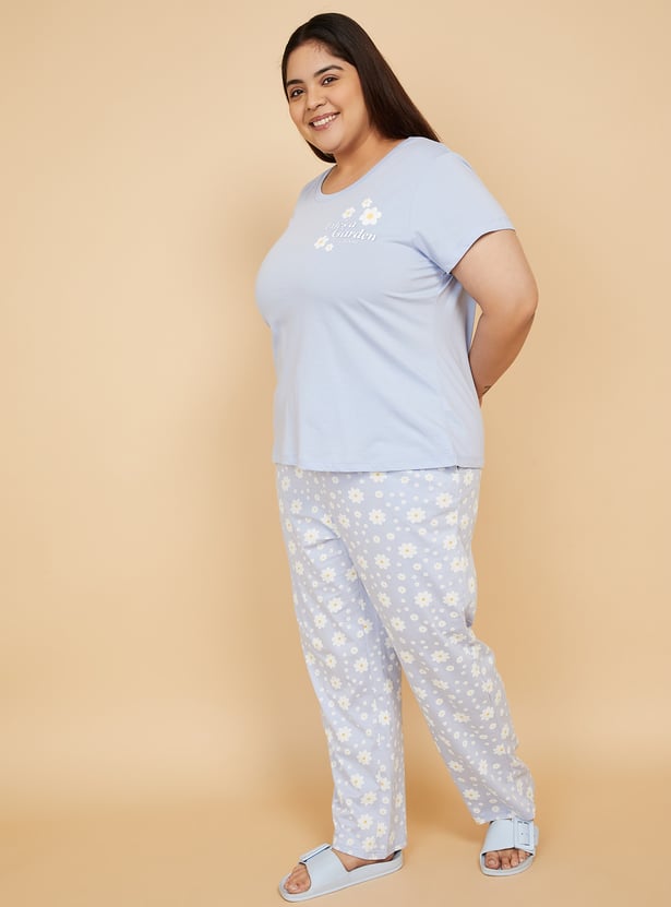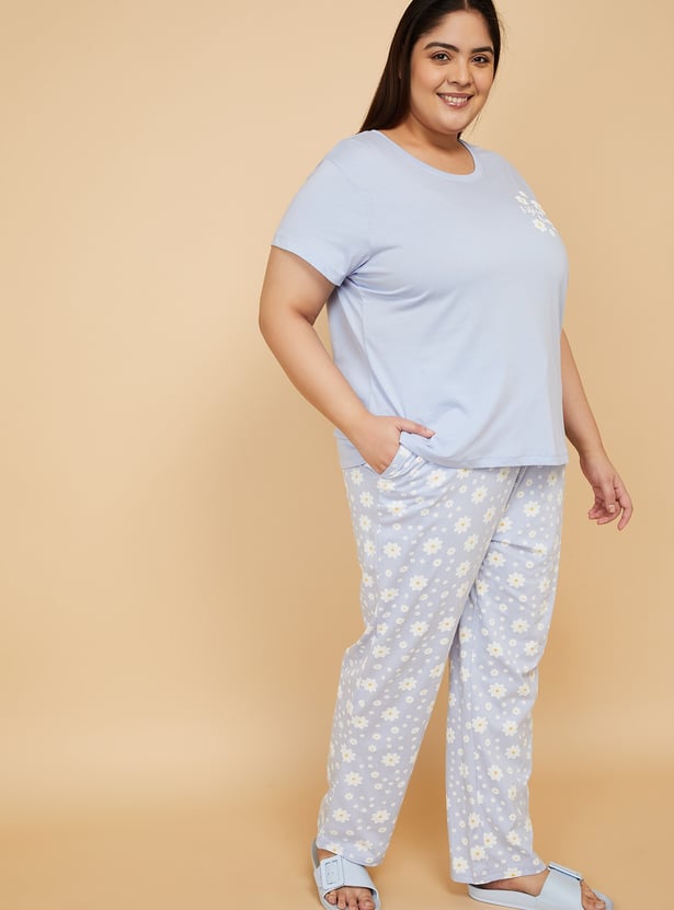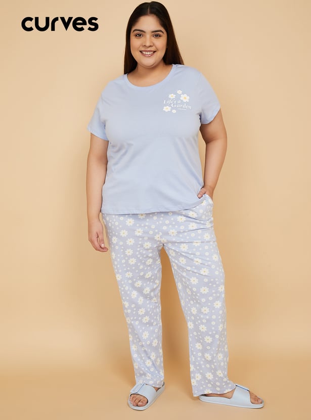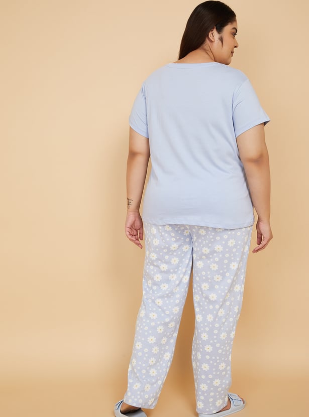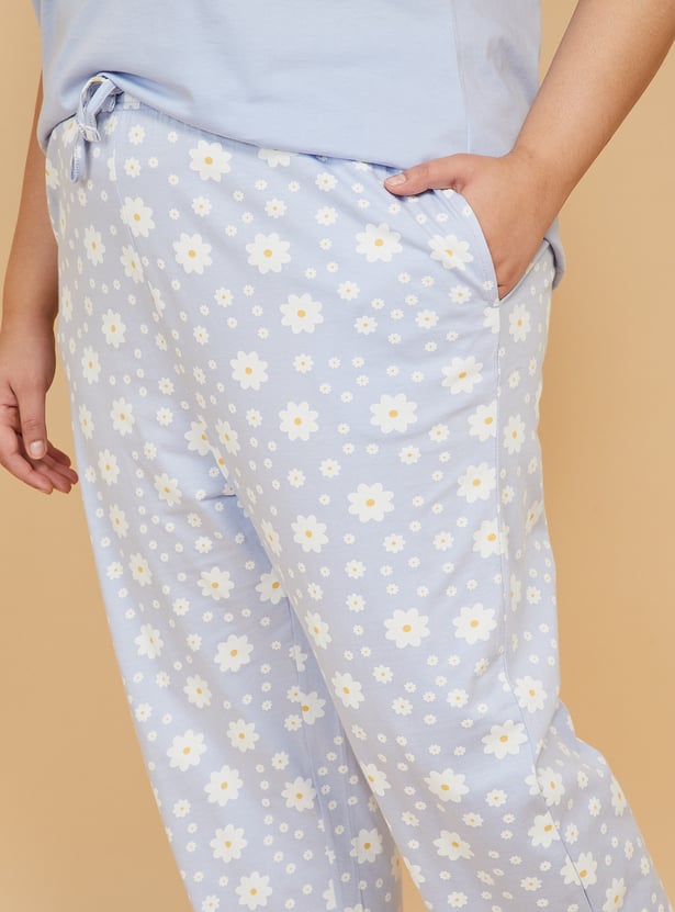 Stay cozy with this floral print PJ set featuring a round-neck, half-sleeve T-shirt paired with comfortable pyjamas with a drawstring waist and pockets. Model Size :