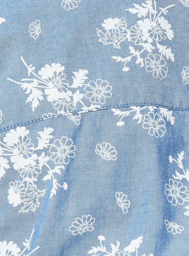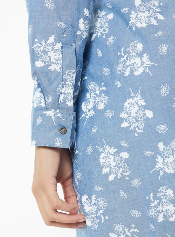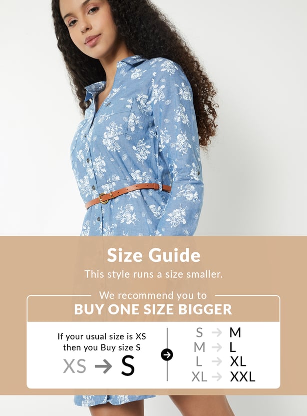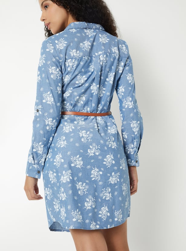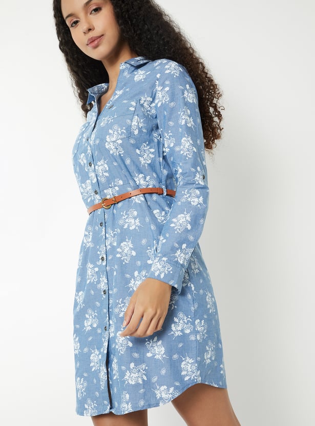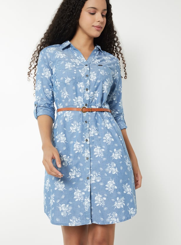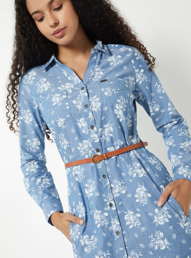 Brighten your wardrobe with this floral print shirt dress featuring a smart spread collar, a neat button placket, and a flattering belted waist. Designed in a chic knee length with full sleeves, it offers an easy blend of structure and flow.