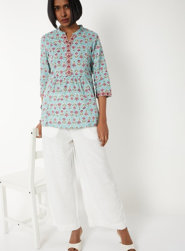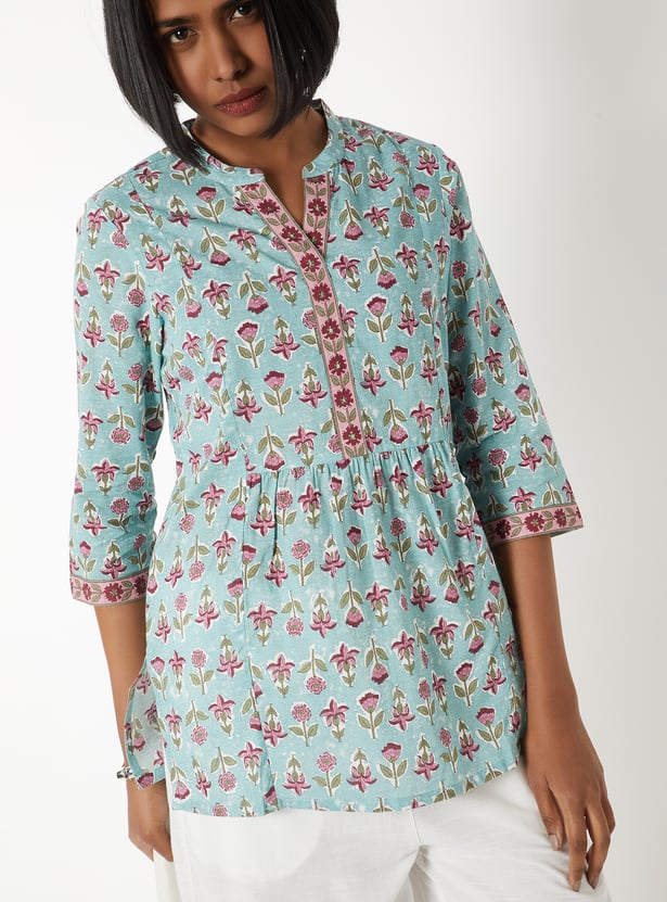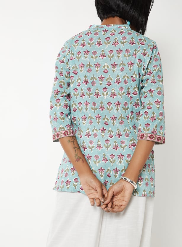 This floral print short kurti is a chic everyday essential. Featuring a band collar and 3/4th sleeves, it offers a structured yet comfortable fit. Side slits add ease of movement, while the side pocket brings practical functionality.