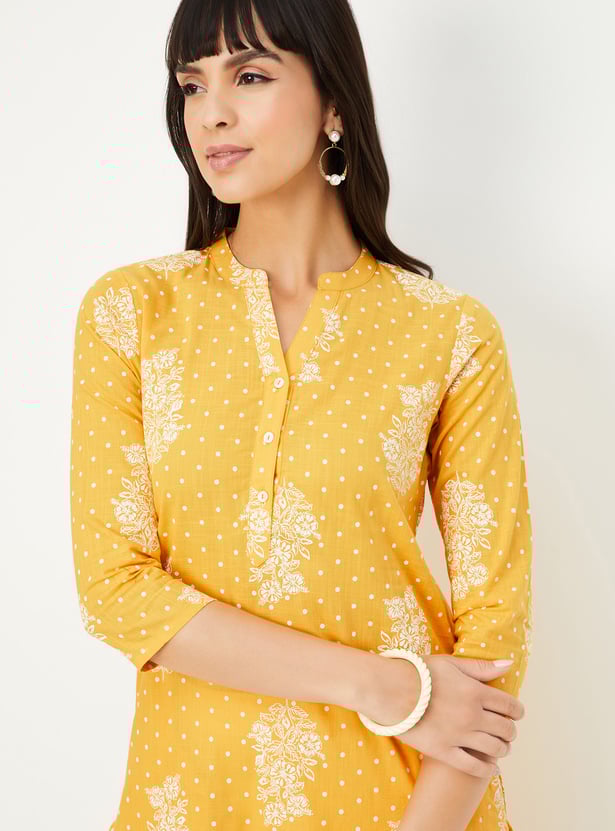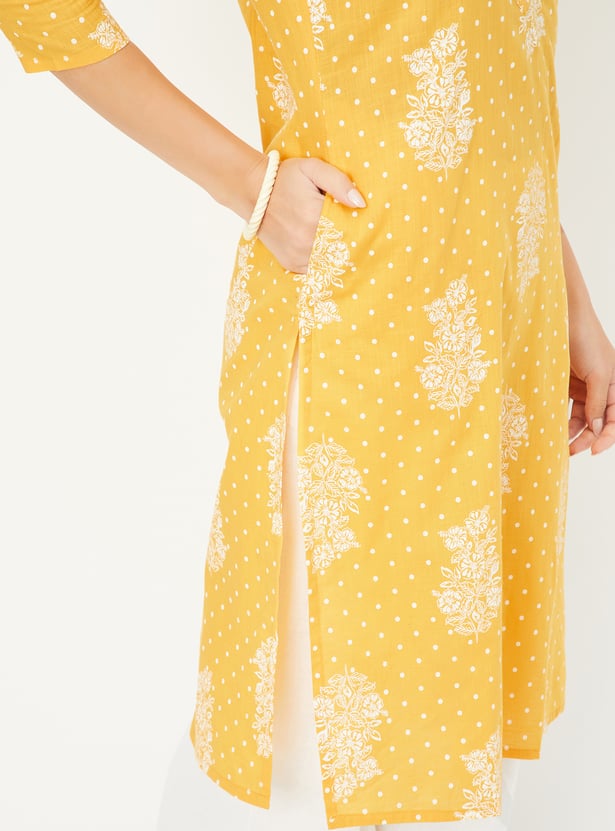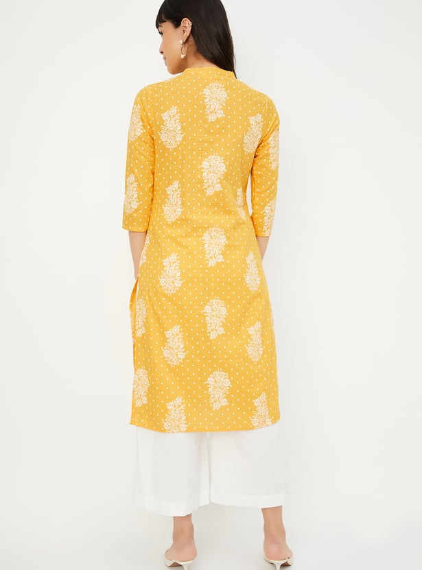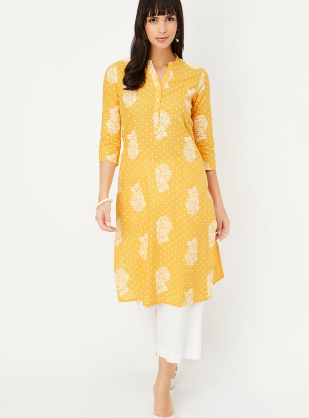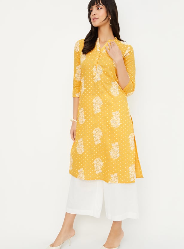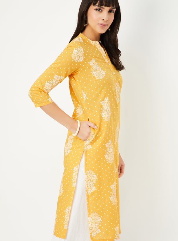 Add a touch of floral finesse to your everyday style with this printed straight kurta. Designed with a mandarin collar, 3/4th sleeves, and side slits, it blends comfort and charm effortlessly.