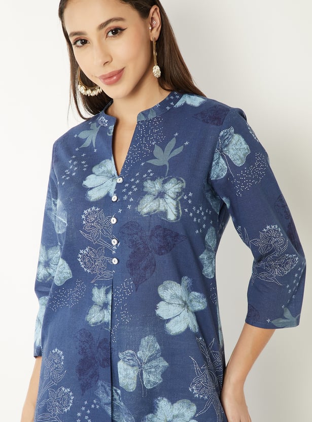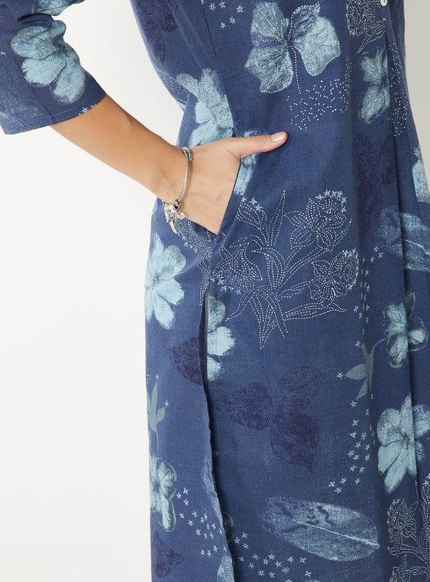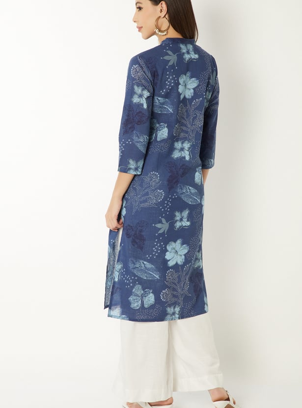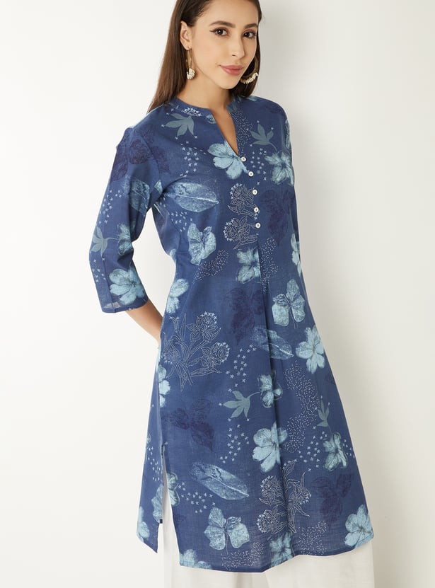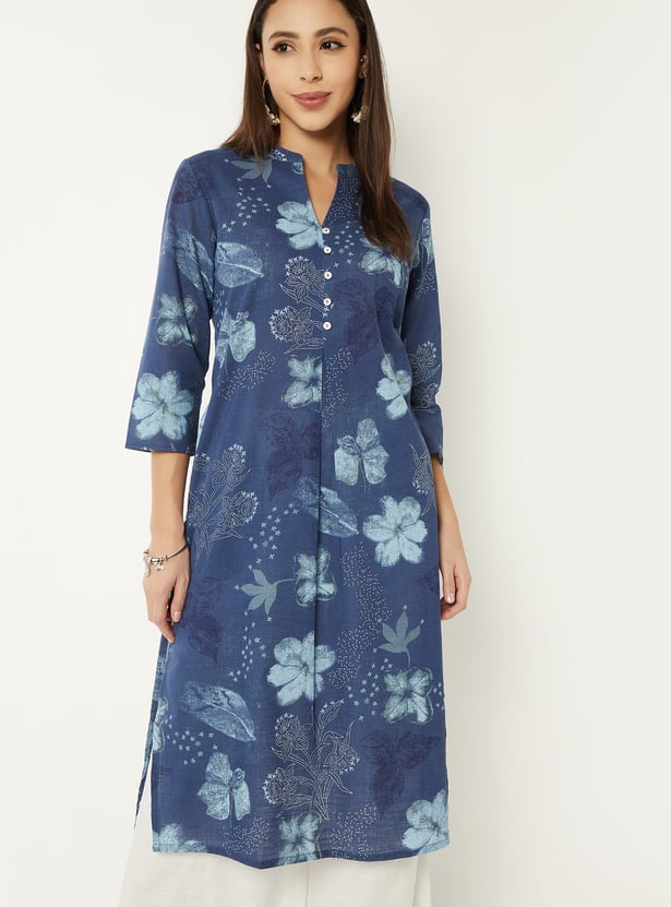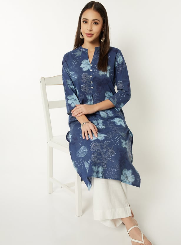 Refresh your ethnic wardrobe with this floral printed kurta designed for everyday wear. Featuring a button-down front, 3/4th sleeves, band collar, straight silhouette, regular fit, and a functional side pocket.