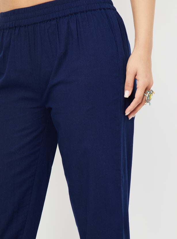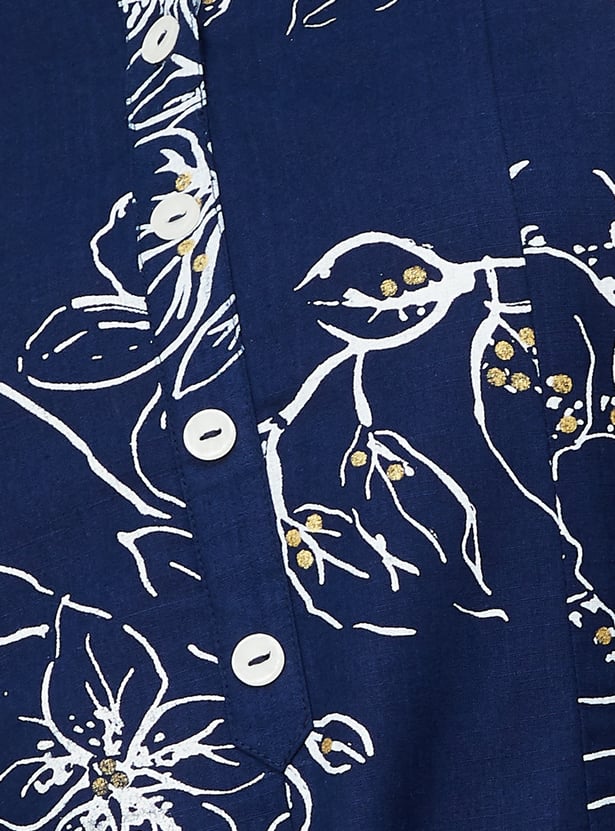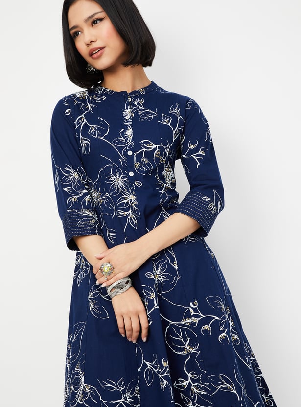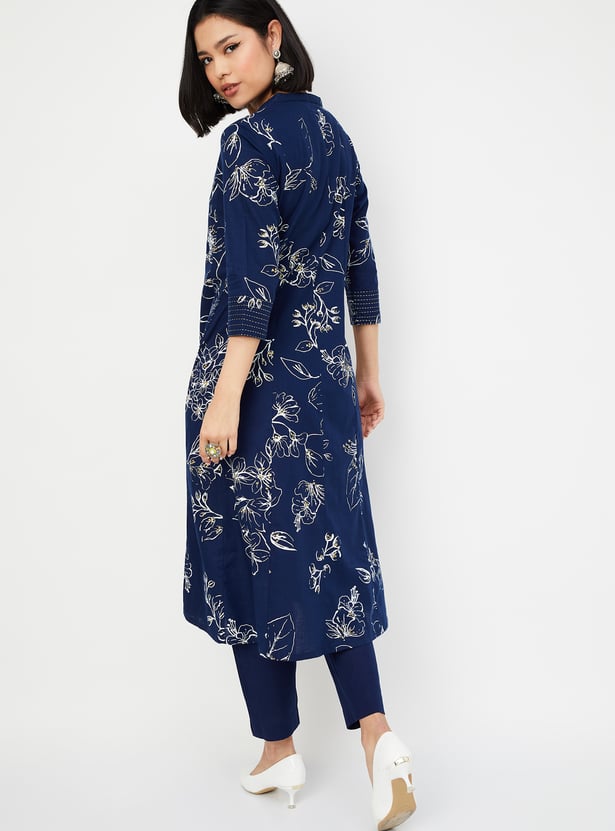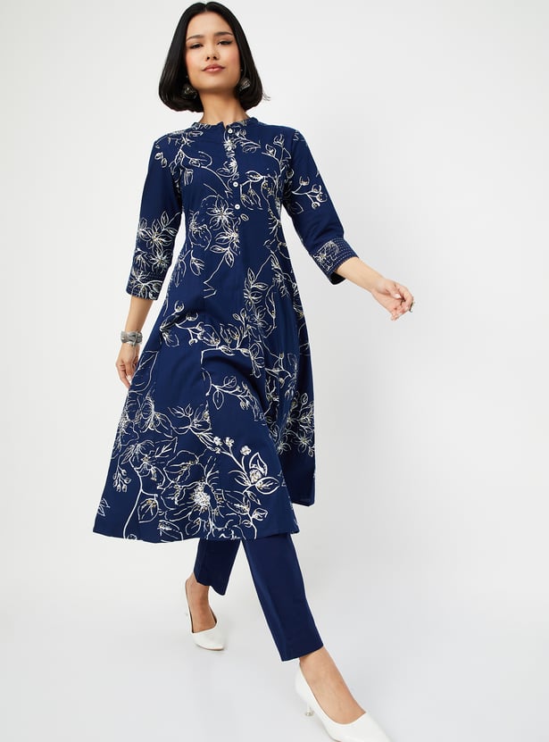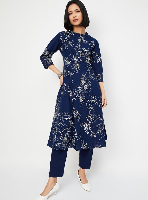 Elevate your style with this floral printed straight kurta set. The kurta features a band collar, 3/4th sleeves, side pocket, and side slits, while the straight pants with an elasticated waist offer comfort and ease. Perfect for casual or semi-formal occasions.