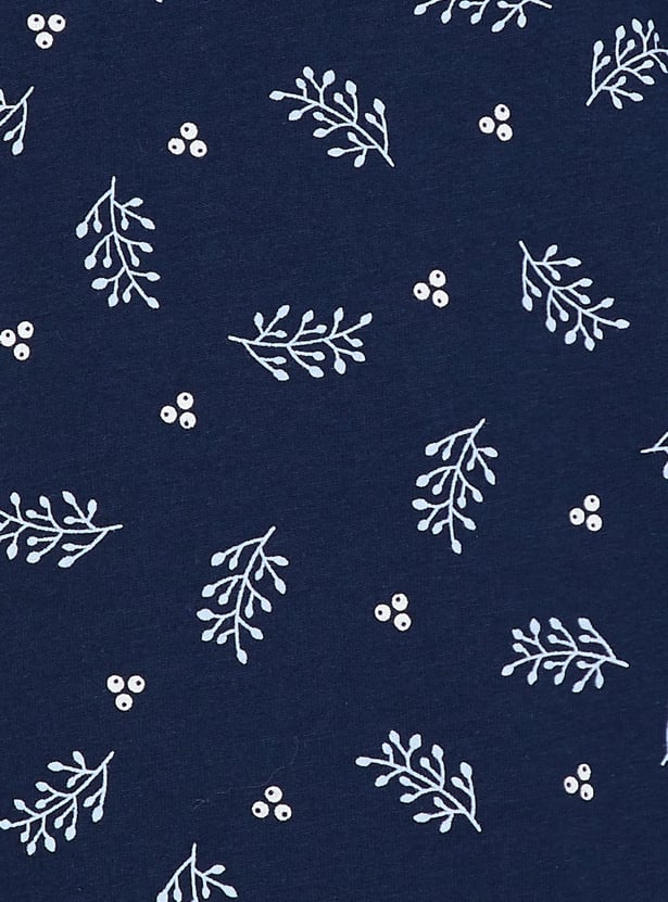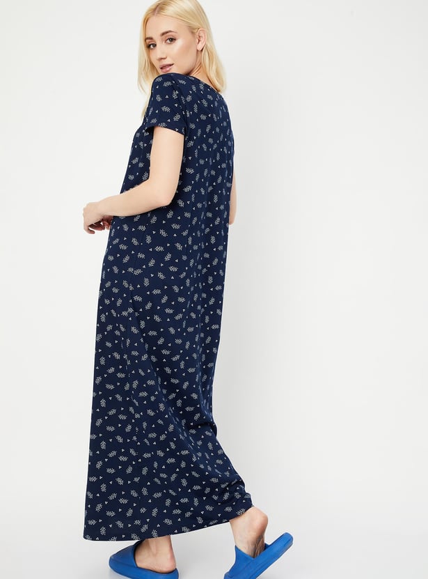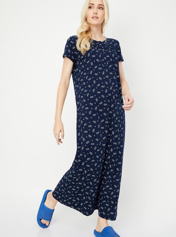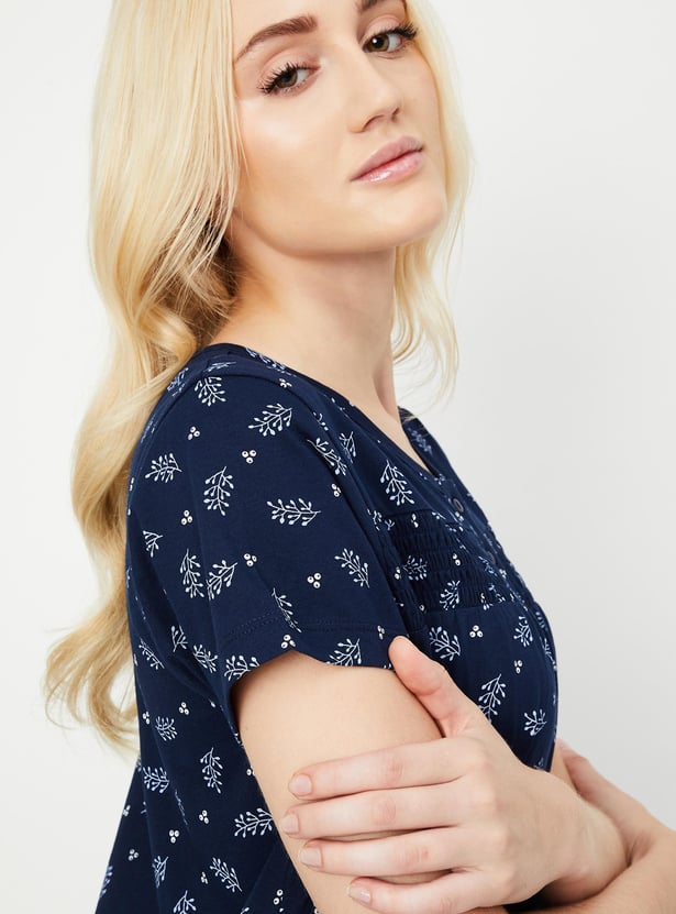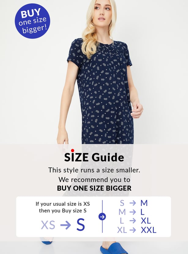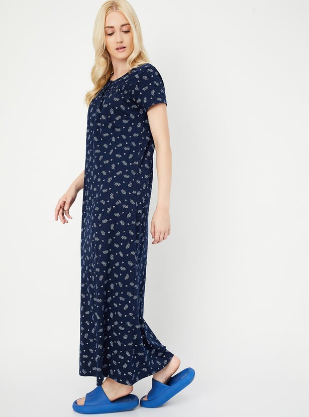 Get a good night's sleep by relaxing in this nightgown. It features all-over prints, a round neck, short sleeves, a smocked detail at the yoke, and a button closure.
