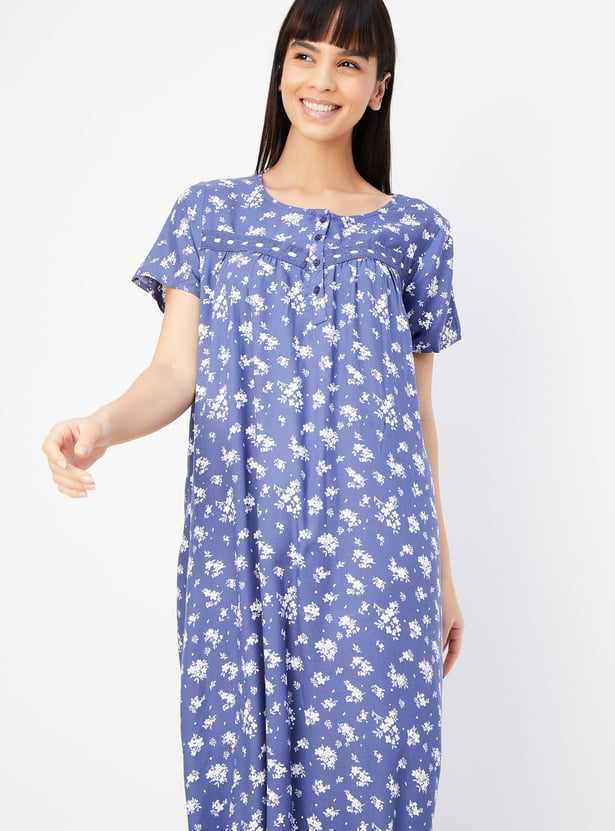 Get a good night's sleep by relaxing in this nightgown. It features all-over prints, a round neck, short sleeves, a lace detail at the yoke, and a button closure.