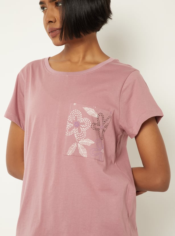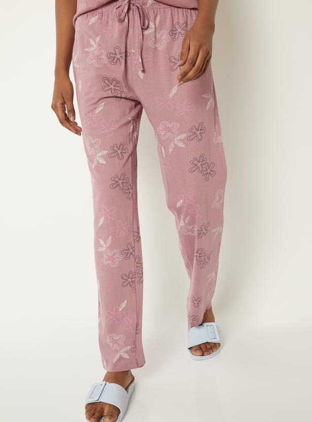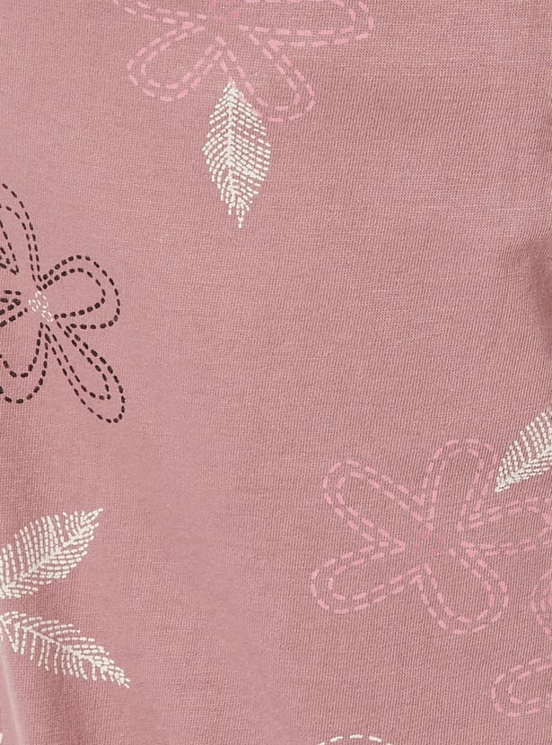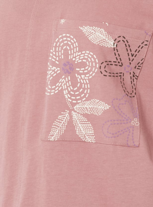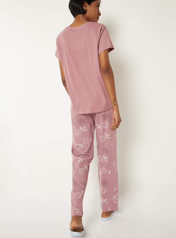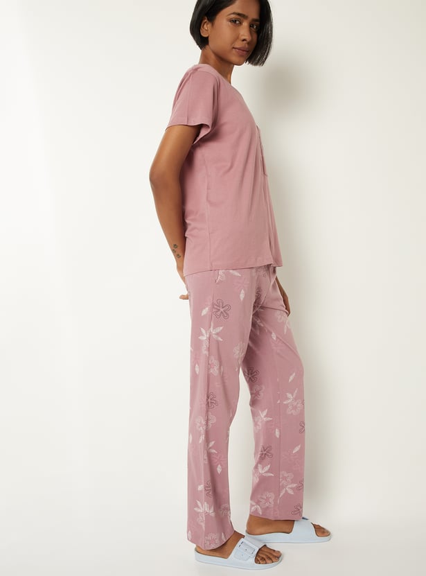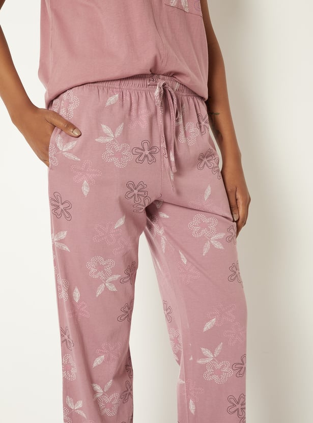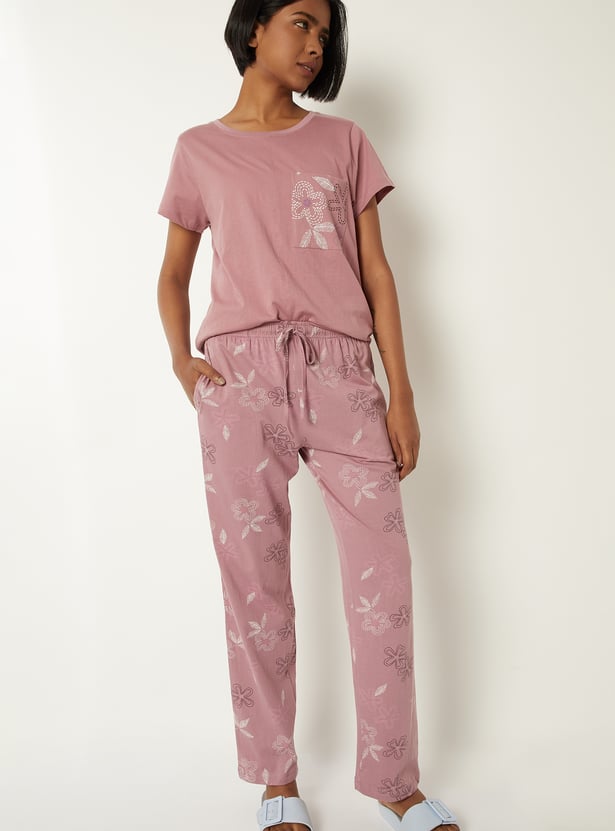 Relax and chill with this printed sleepwear set. It includes a T-shirt with a round neck, half sleeves and a patch pocket along with a pair of matching all-over printed pyjamas with an elasticated waist and drawstring.