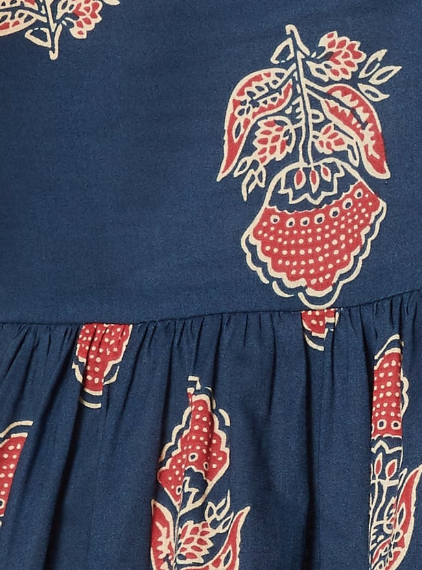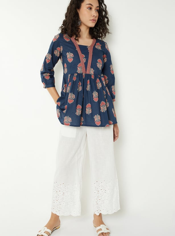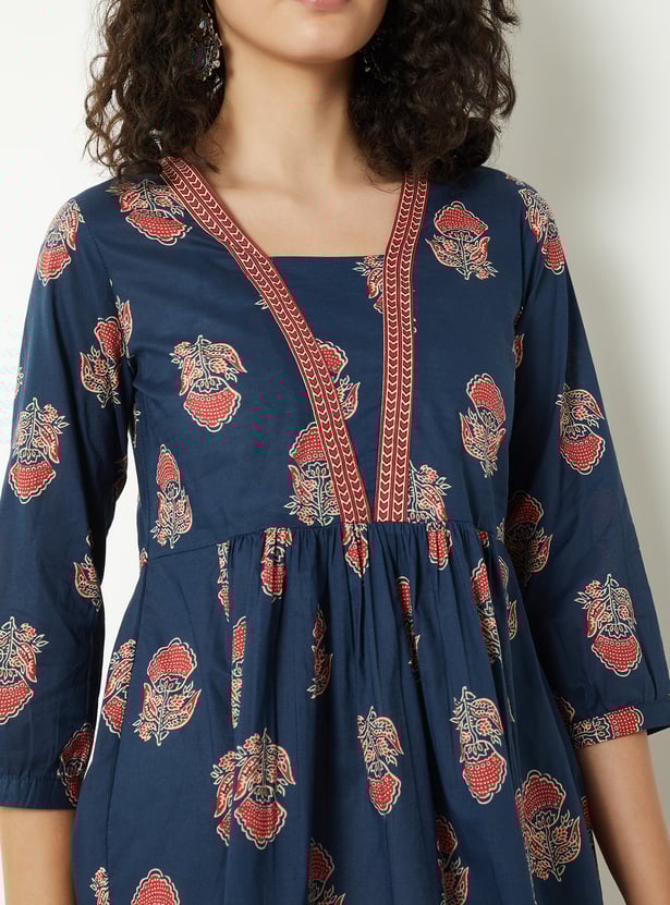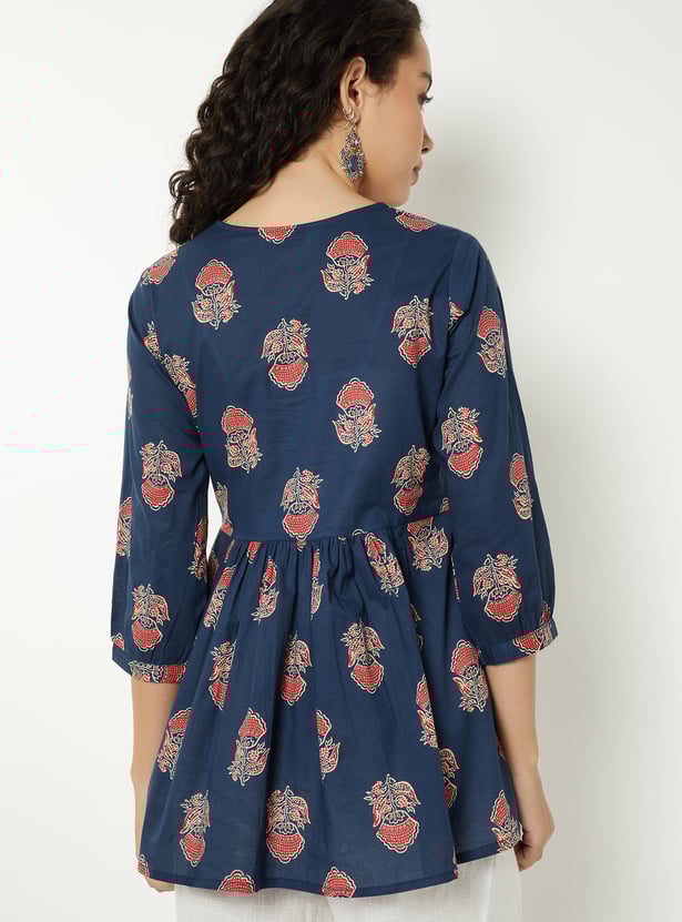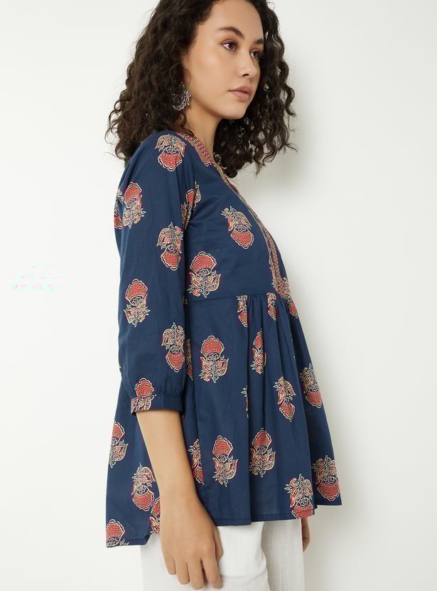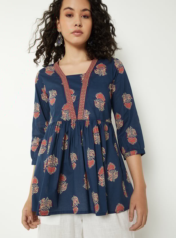 Elevate your everyday style with this floral printed short kurti. Featuring a stylised neckline and 3/4th sleeves, it combines comfort with elegance. The gathered detailing adds a touch of charm to its design.