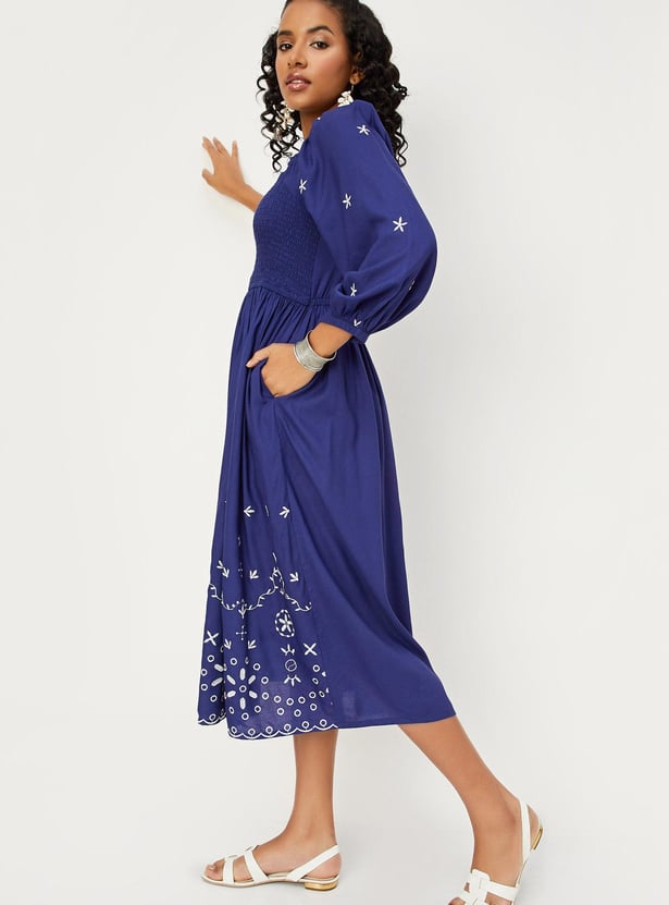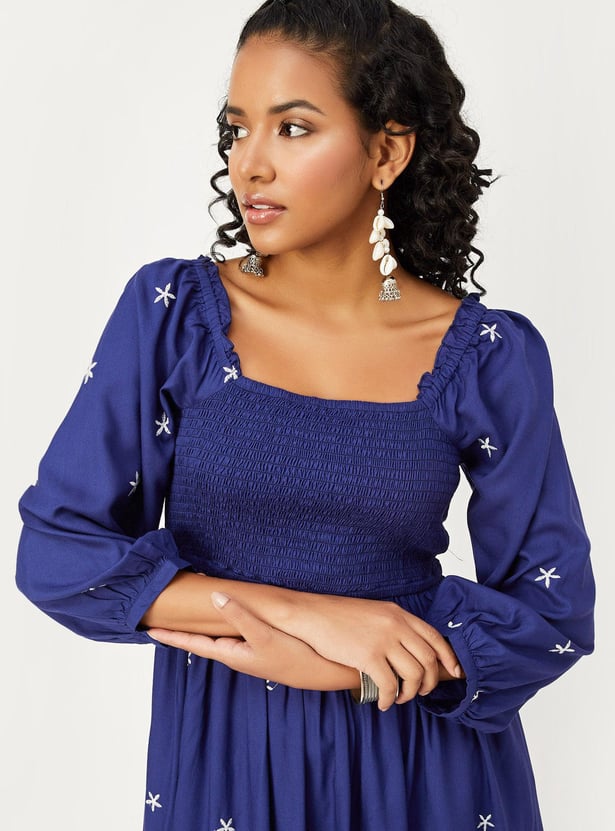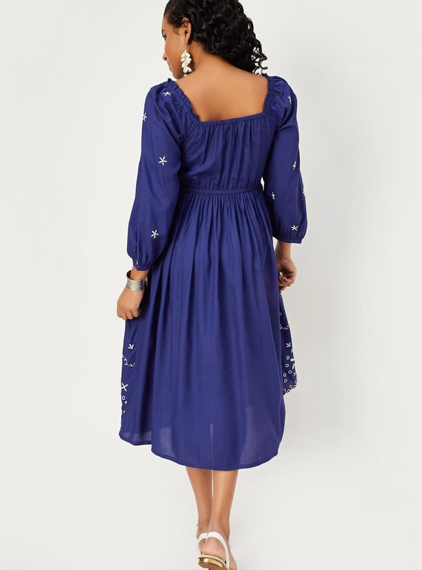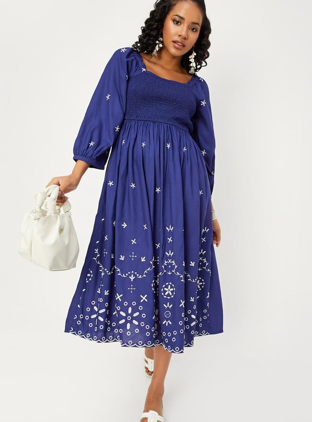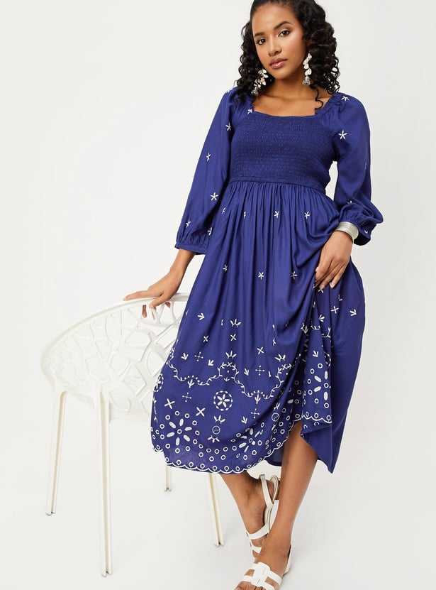 Add a touch of floral elegance to your wardrobe with this floral printed midi dress featuring a square neckline, three-quarter sleeves, an open back, and a flared hemline. The dress has a delightful floral print, making it a versatile choice for casual outings and more formal affairs.