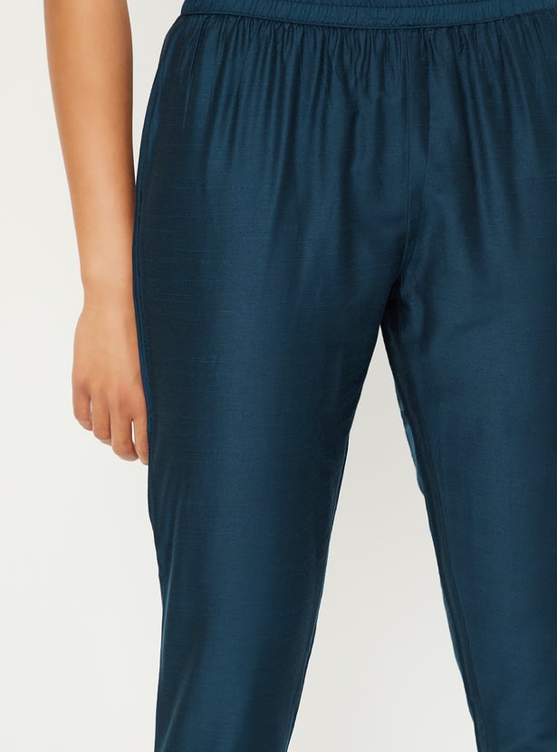 This foil print A-line kurta set blends festive shimmer with everyday elegance. The kurta features a round neck, 3/4th sleeves, and a handy side pocket, while the straight pants come with an elasticated waist for all-day comfort and ease.