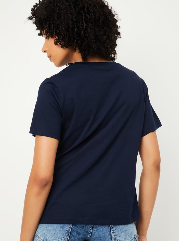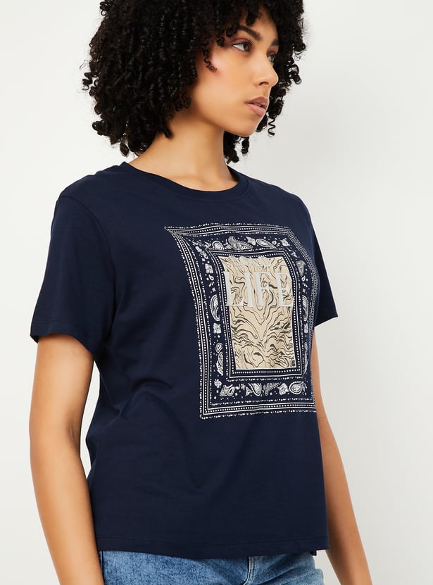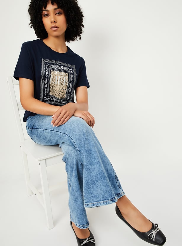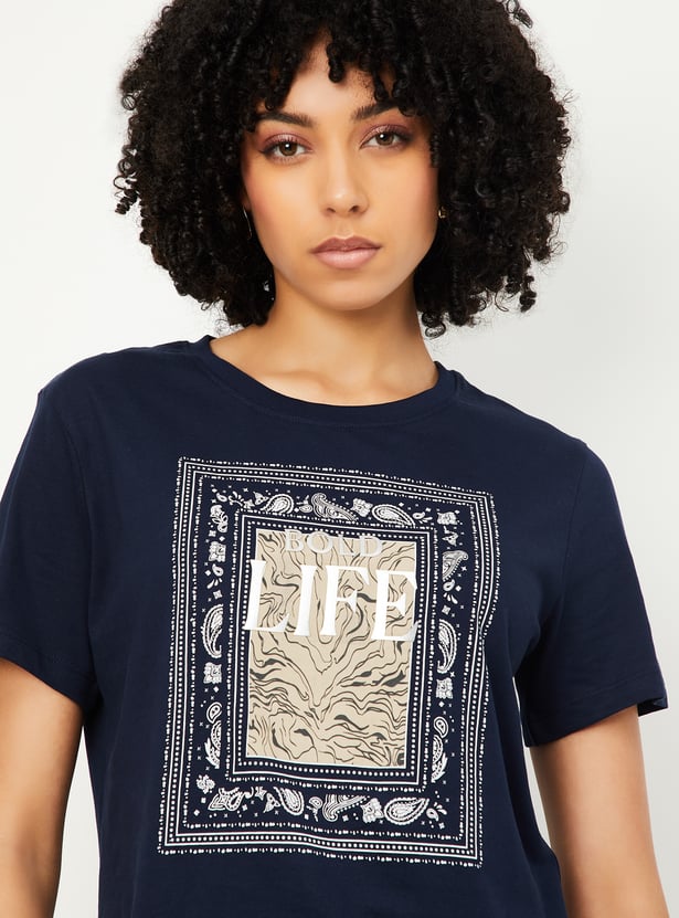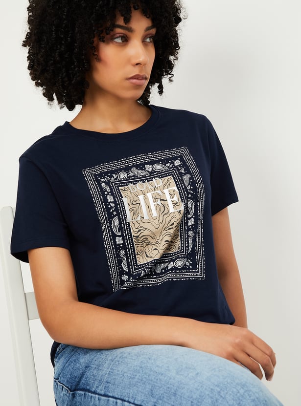 This printed t-shirt adds a charming touch to your everyday style with its soft prints and classic silhouette. Featuring a round neck and half sleeves, it's perfect for easy, all-day comfort. Model Size :