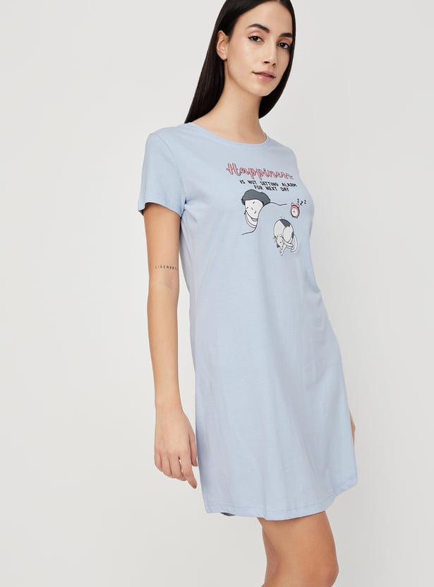 Relax and chill at home with this comfy chemise, featuring a round neck, short sleeves, and a cute graphic print on the front. Perfect for lounging in style and comfort.