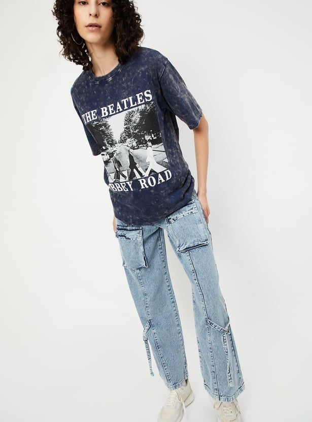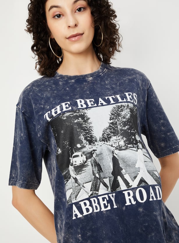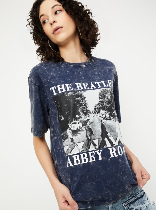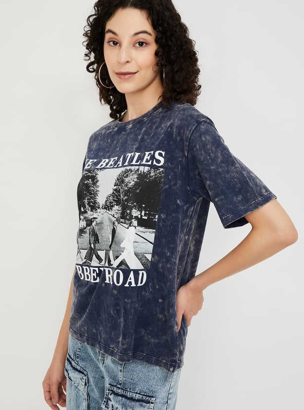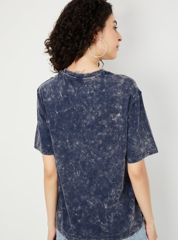 Elevate your casual style with this graphic print T-shirt, featuring a classic round neck and half sleeves. The acid-washed surface adds a laid-back vibe, making it a perfect addition to your everyday wardrobe.