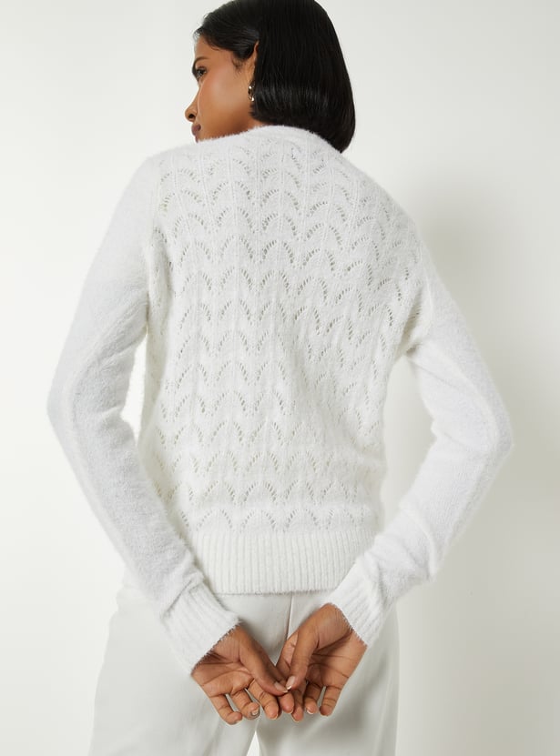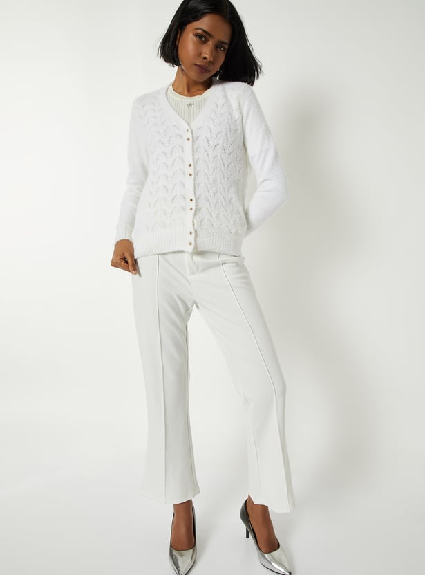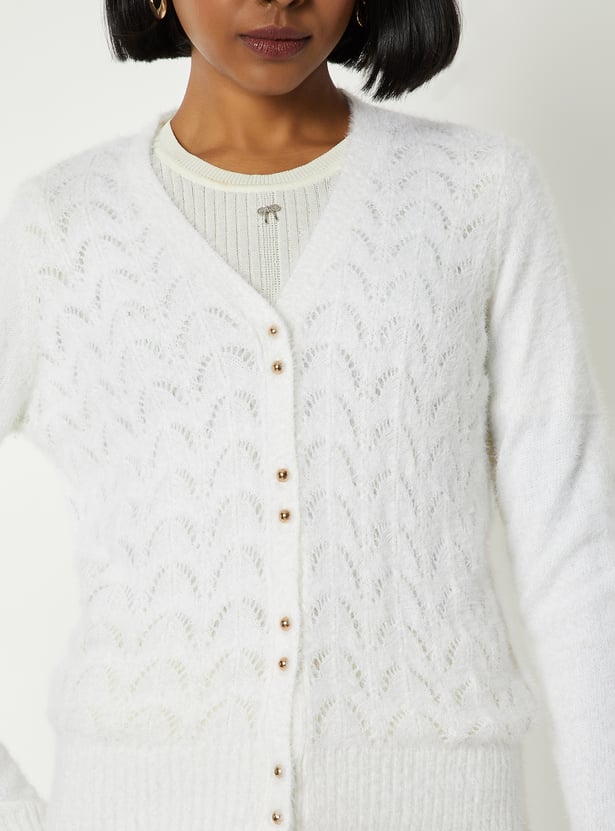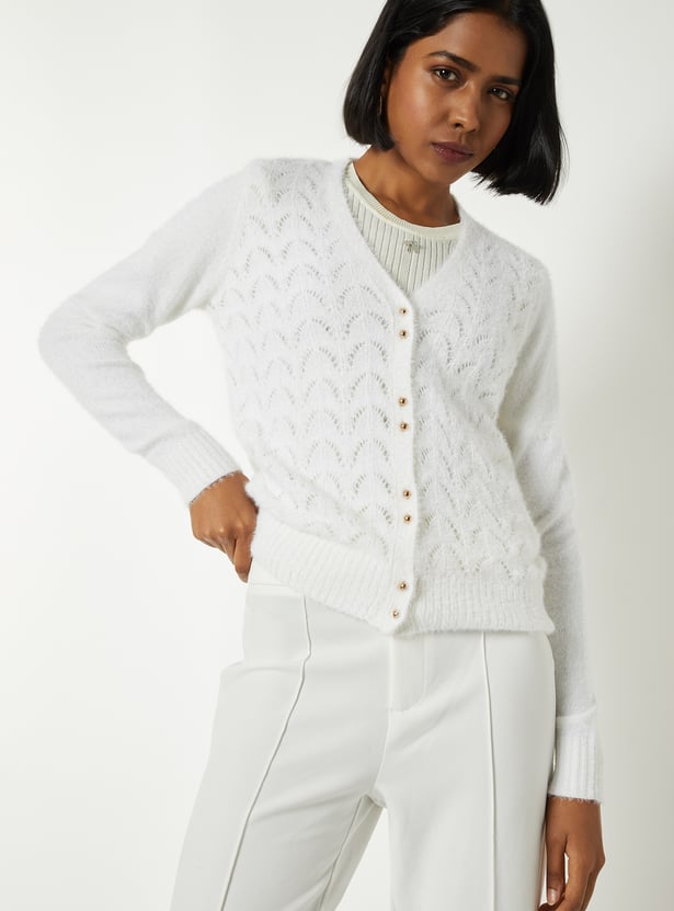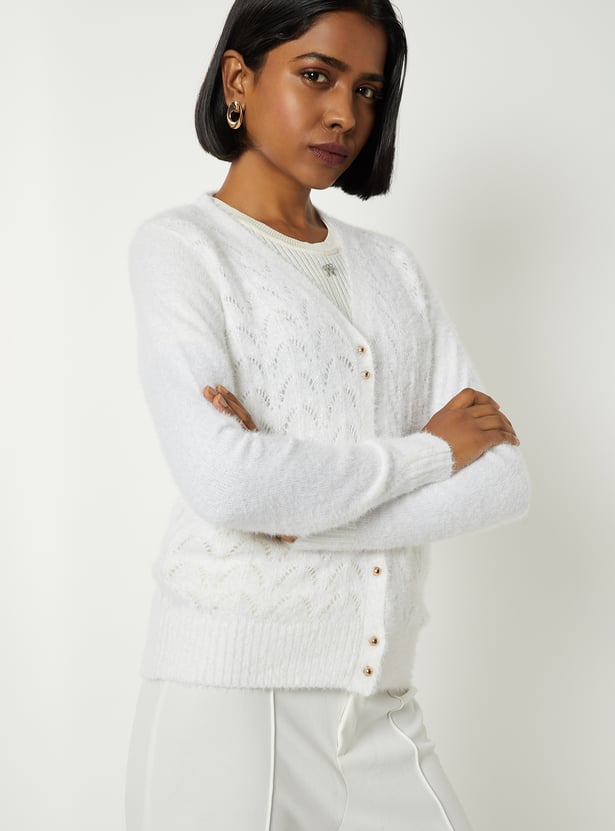 Classic and cozy, this knit cardigan features a flattering V-neck, full sleeves, and a front button placket. The textured knit adds warmth and charm, making it a layering essential for cooler days.