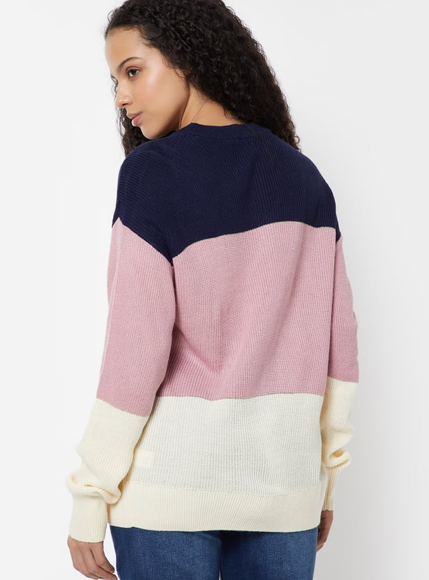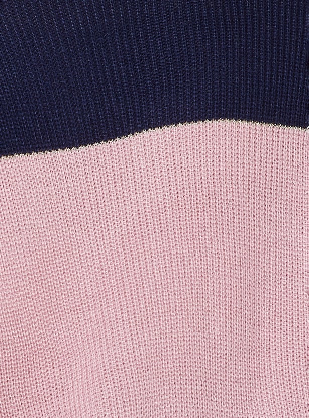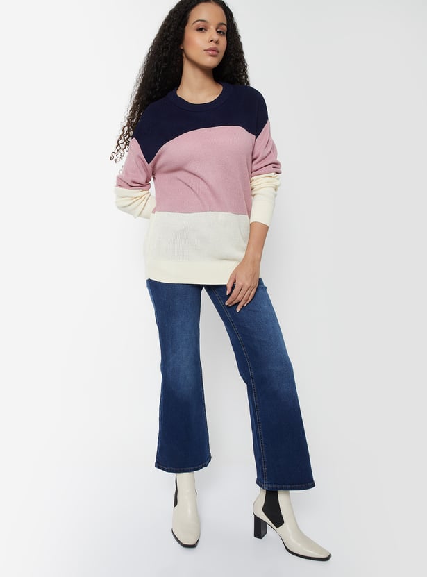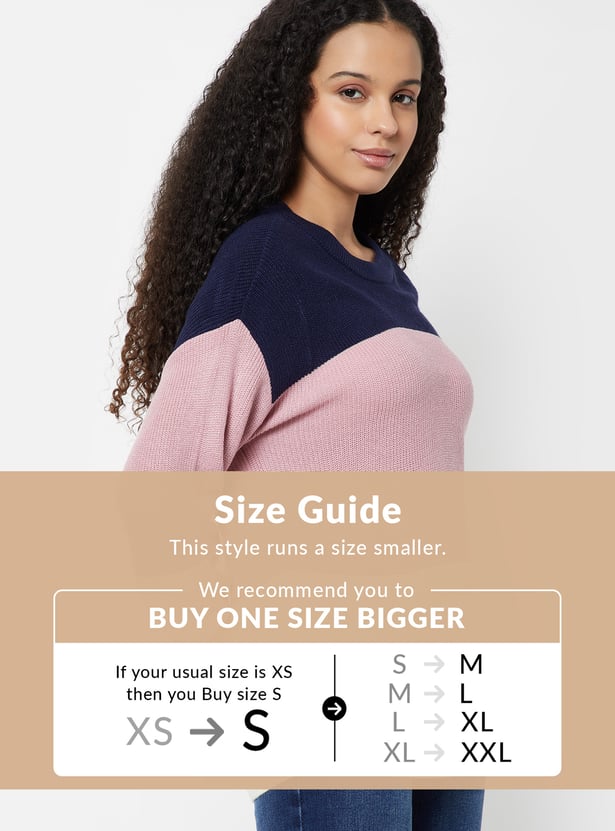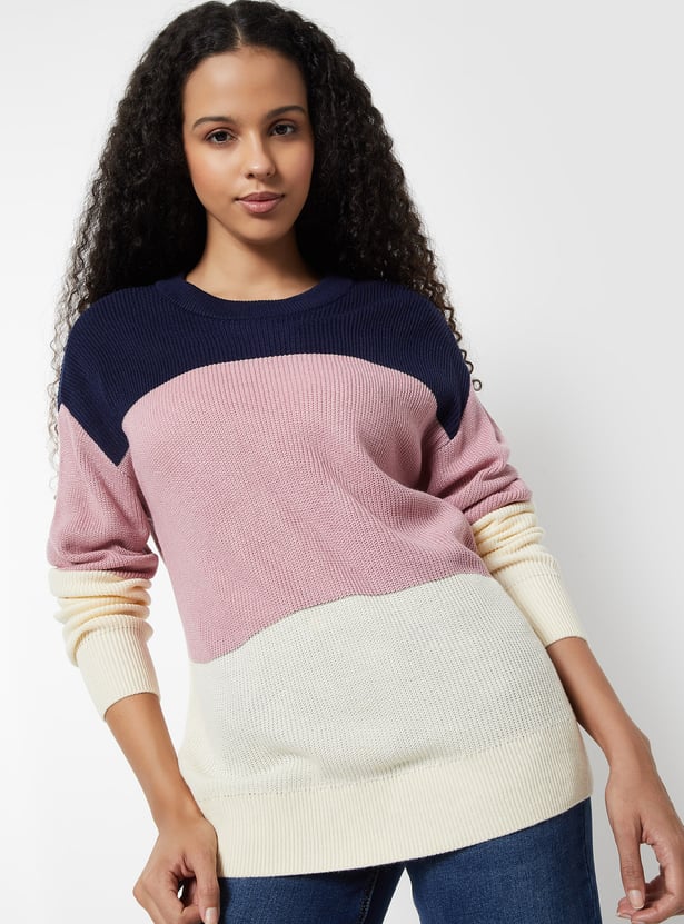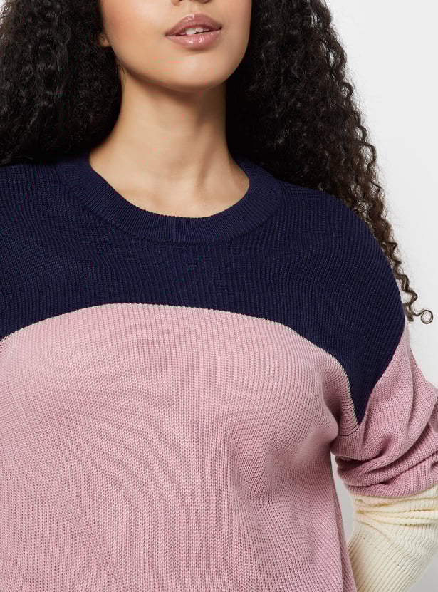 Stay warm and stylish in this knit colourblock sweater featuring a classic round neck and full sleeves for a cozy, modern look. Model Size :