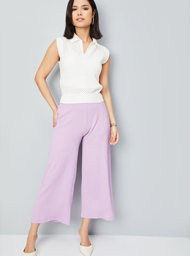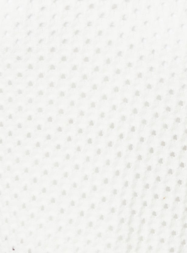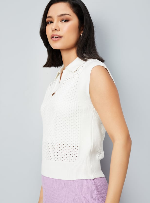Add some texture to your wardrobe with this open-knit sleeveless top! Featuring a chic collared design and a ribbed hem, it’s the perfect mix of relaxed and trendy.