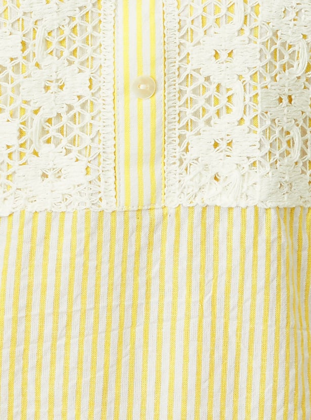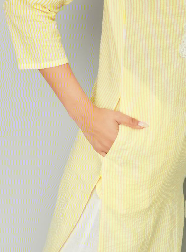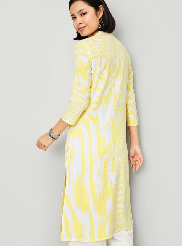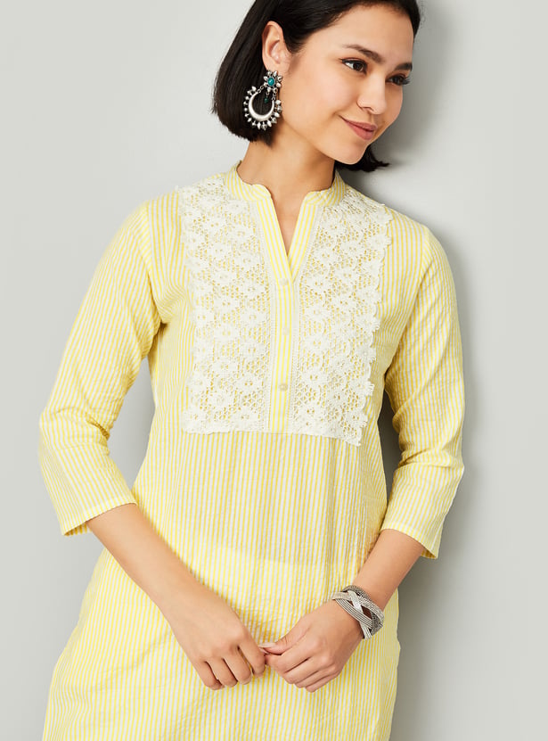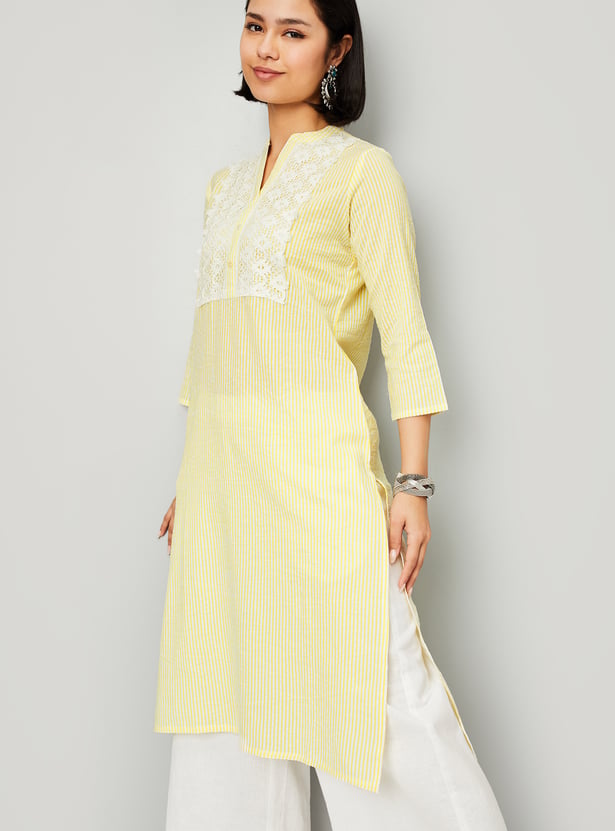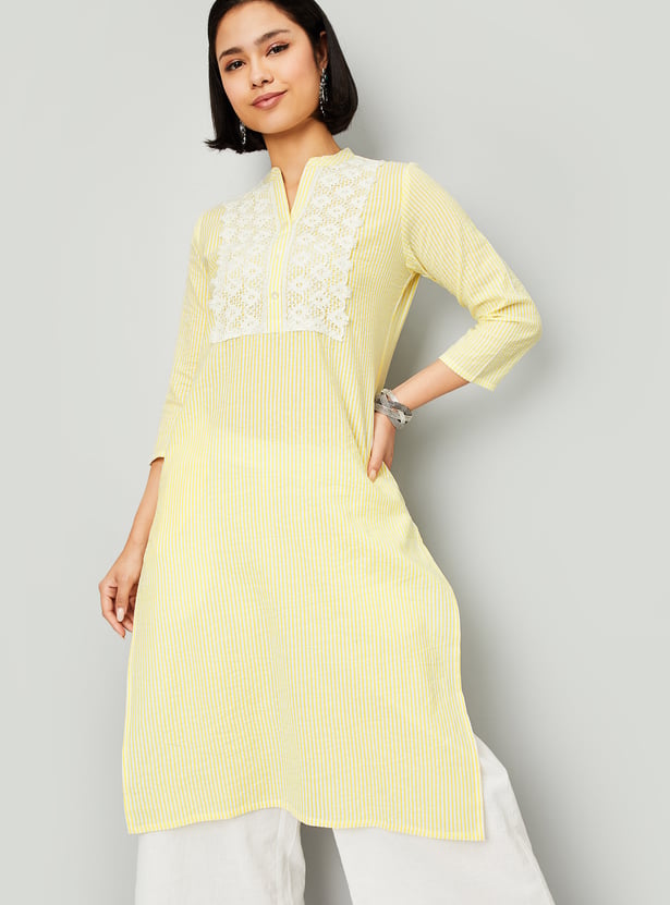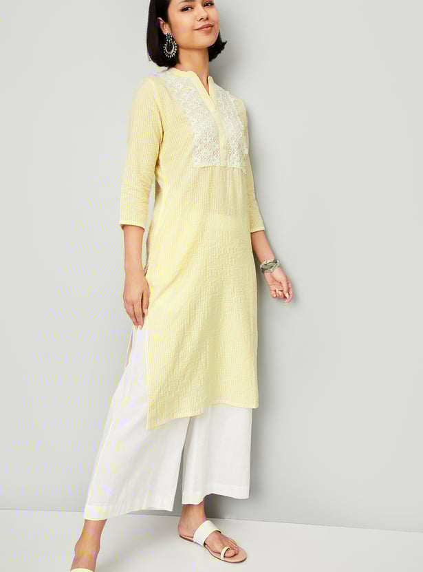 This striped straight kurta features intricate lace detail, 3/4th sleeves, side slits, side pocket, and a band collar for a sophisticated, refined look. The straight silhouette provides a flattering fit, while the lace adds an elegant, textured touch.