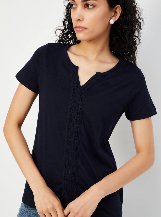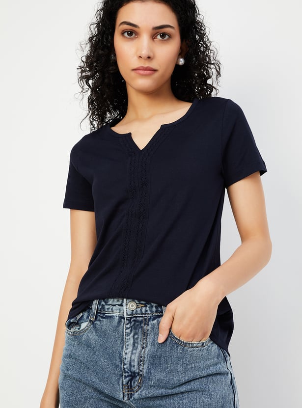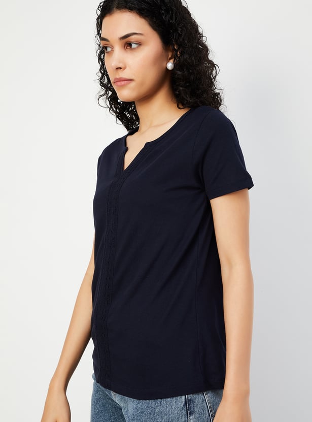 Spruce up your casual look with this chic T-shirt. Designed with lace detailing on the front, a notched neckline, and half sleeves, it effortlessly adds a touch of elegance to your everyday style.