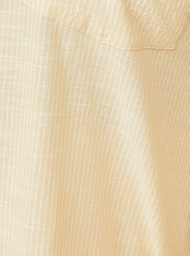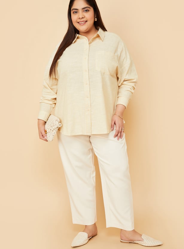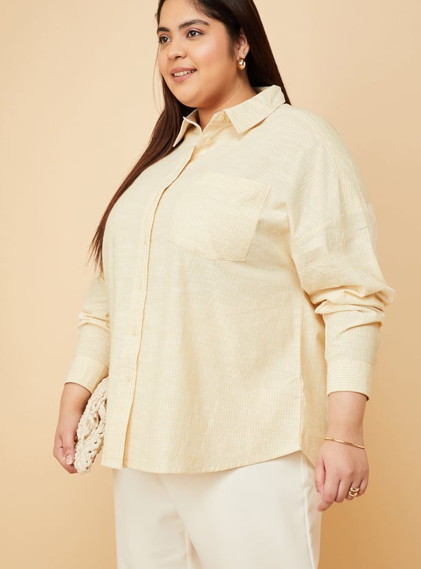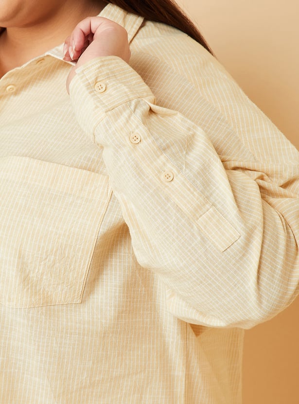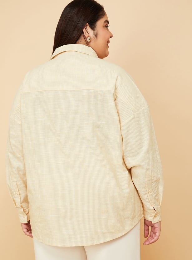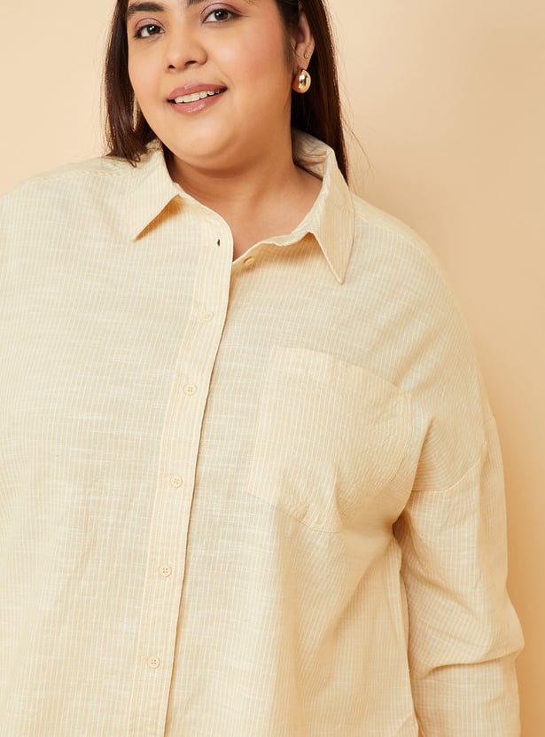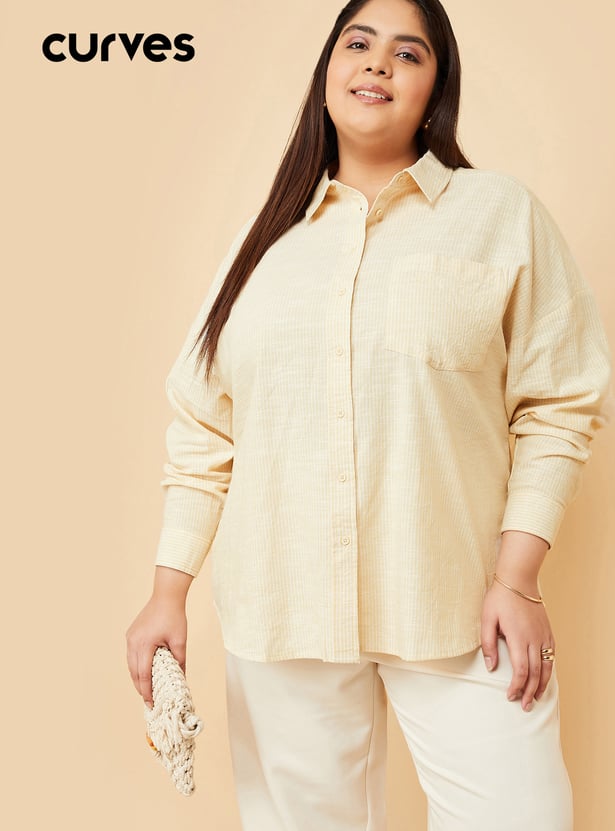 Add a touch of laid-back charm with this striped oversized shirt featuring a spread collar and full sleeves. Its relaxed silhouette makes it perfect for effortless layering or a casual day out. Model Size