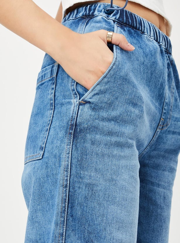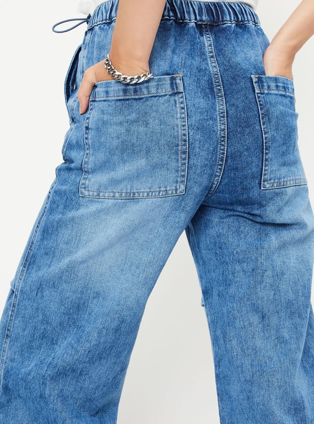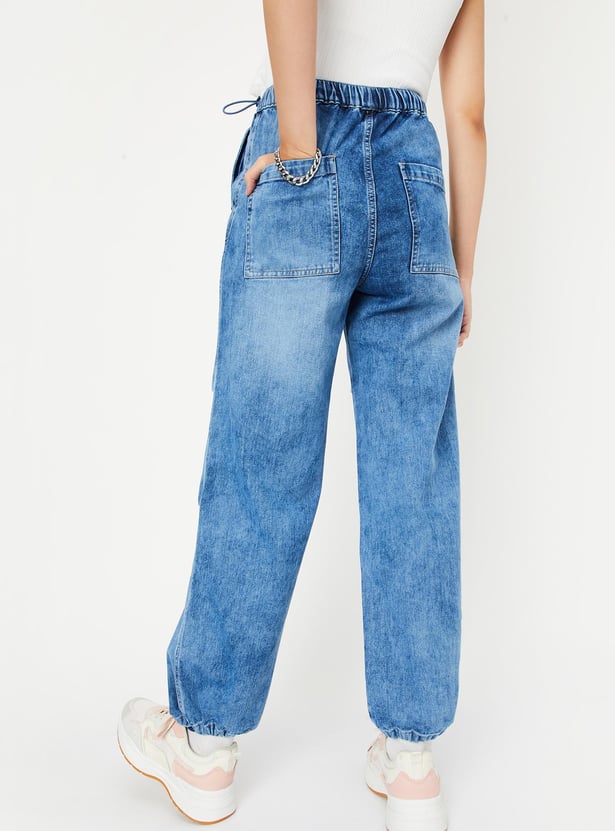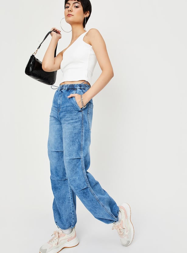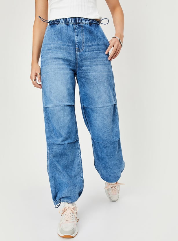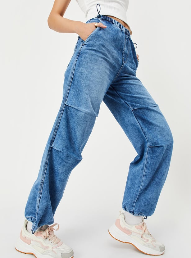 Upgrade your denim wardrobe with this pair of jeans. It is designed with a washed surface, elasticated waist, parachute fit, drawcord at the hem, full-length construction, and pockets.
