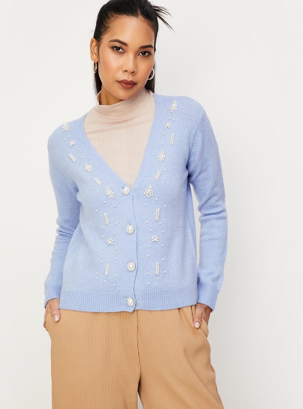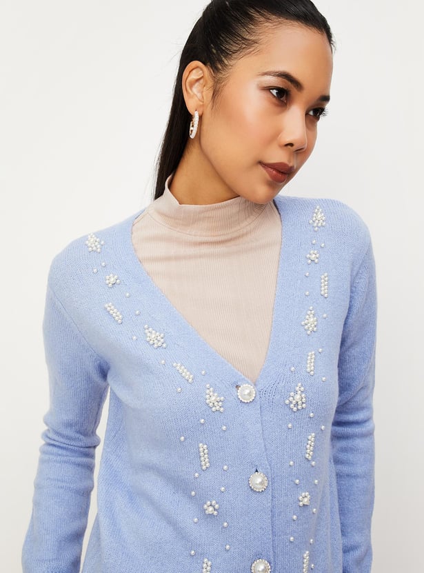 Dress for the season in style with this cardigan that is highlighted with pearl embellishments all over. It is designed with a V-neckline, full sleeves, embellished button closure, and ribbed trim. Layer this cardigan over a tee and team it up with trousers and boots.