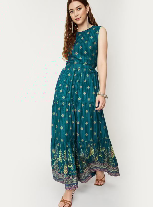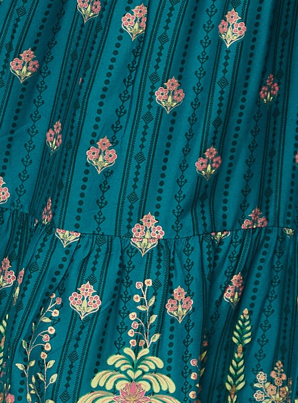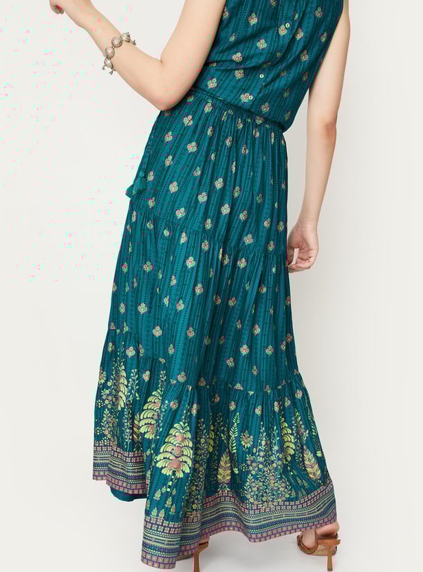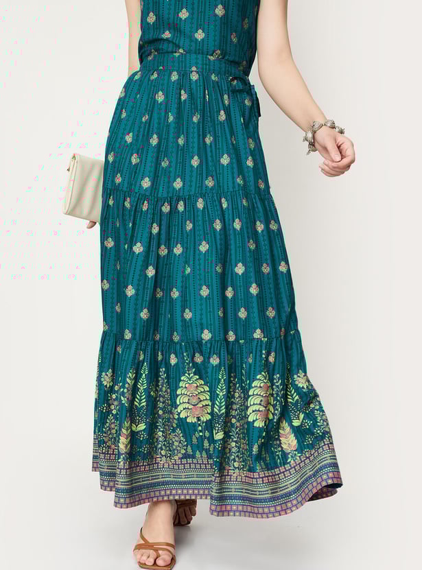 Make your ethnic attire look effortless yet elegant with this tiered skirt. It is designed with a placement print on the surface, full-length construction, and an elasticated waistline with drawstring closure. The best way to make this skirt stand out is to team it up with a cropped top and heels.