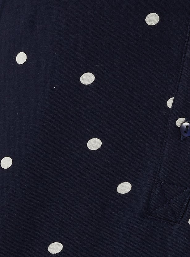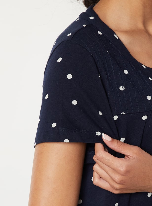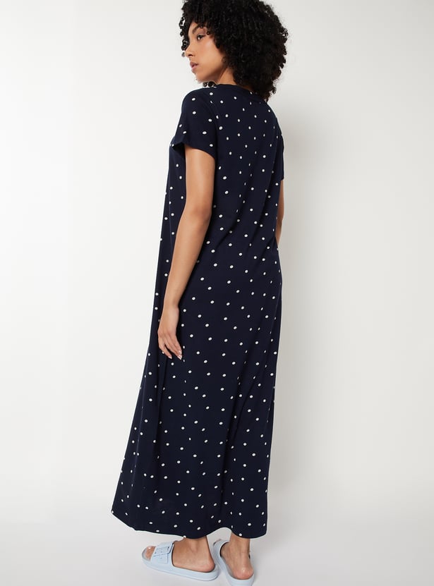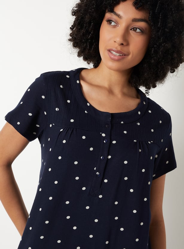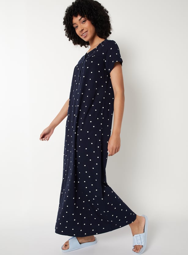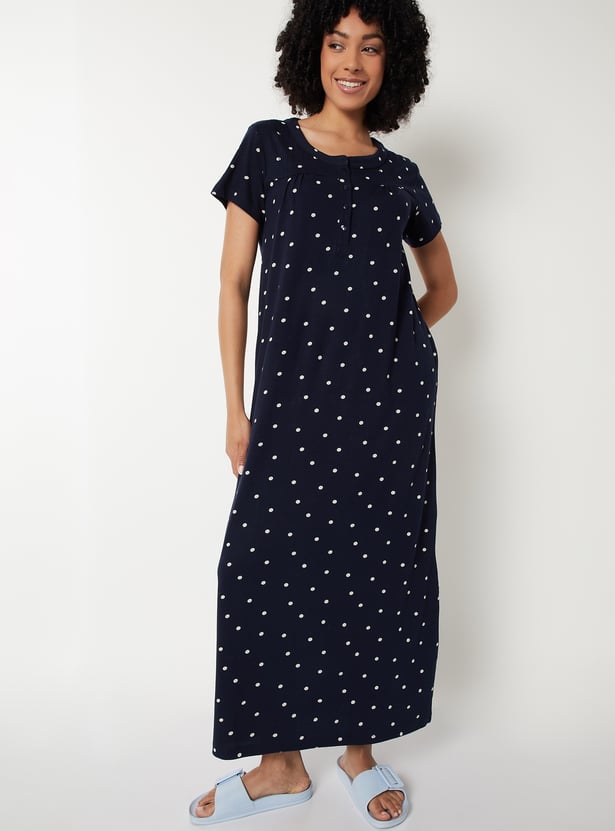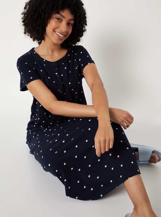 Relax in timeless comfort with this polka dot printed nightgown, featuring a classic round neck, half sleeves, and a functional button placket. The playful print and breathable fabric make it a sleepwear staple you’ll love slipping into. Model Size :