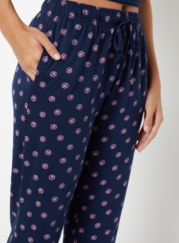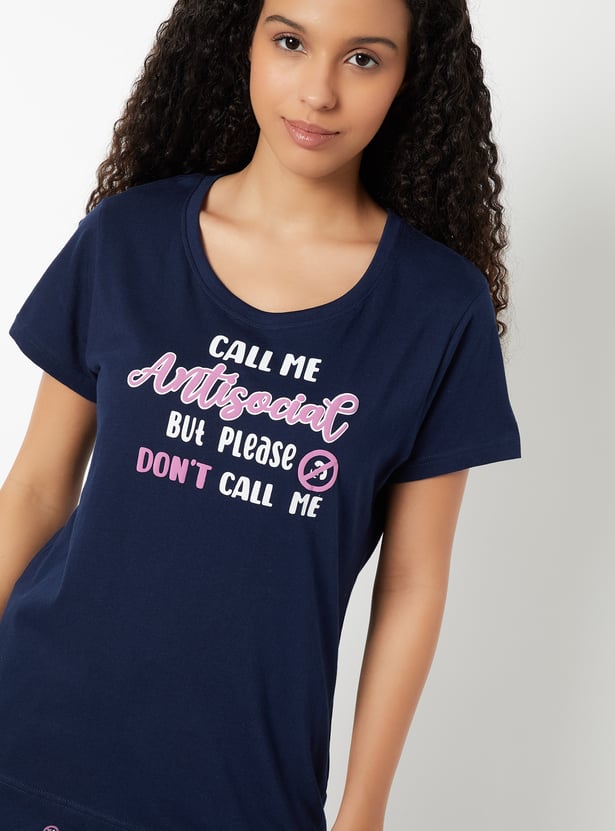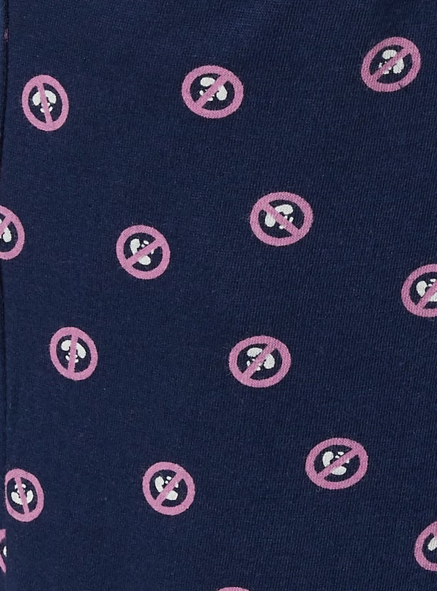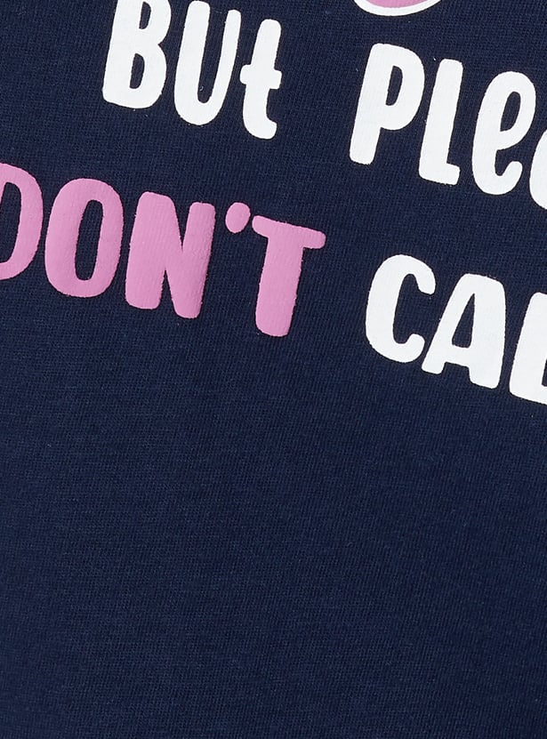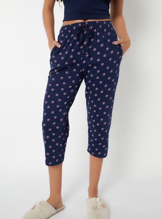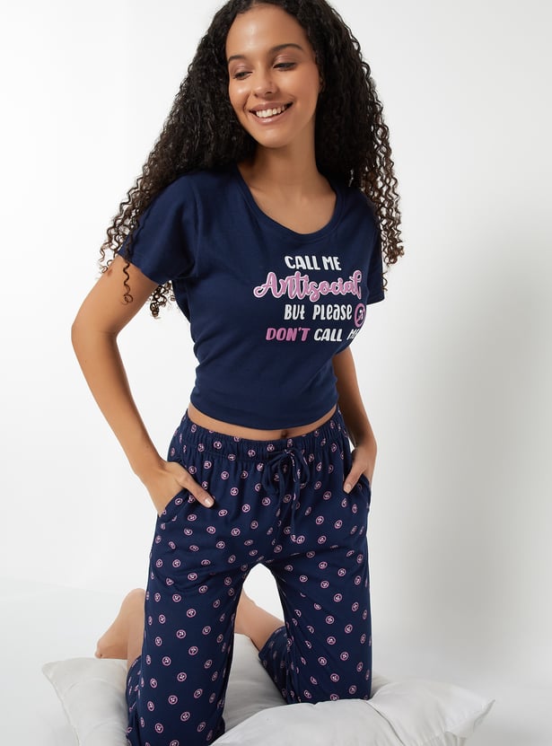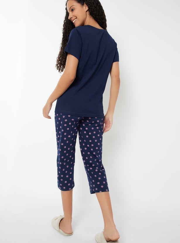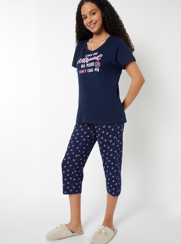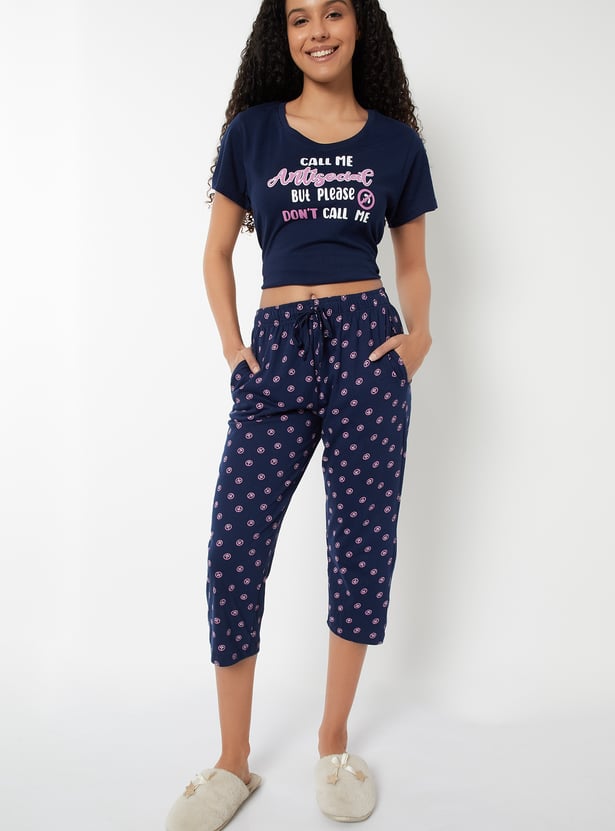 Unwind in style with this printed PJ set, featuring a T-shirt with a round neck and half sleeves, paired with printed capris designed with a drawstring waist and handy pockets. Comfortable and playful, it’s perfect for lounging or bedtime.