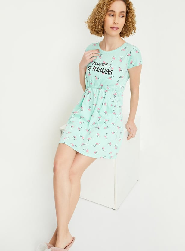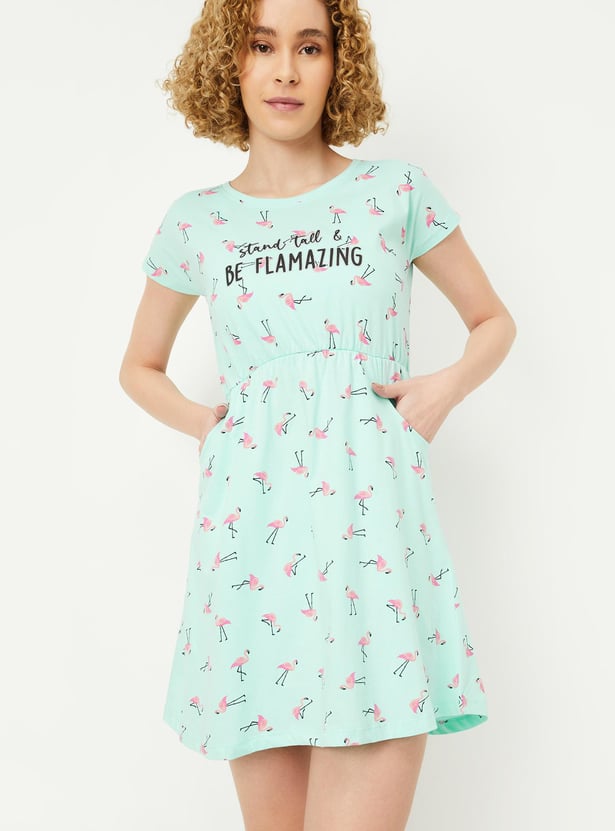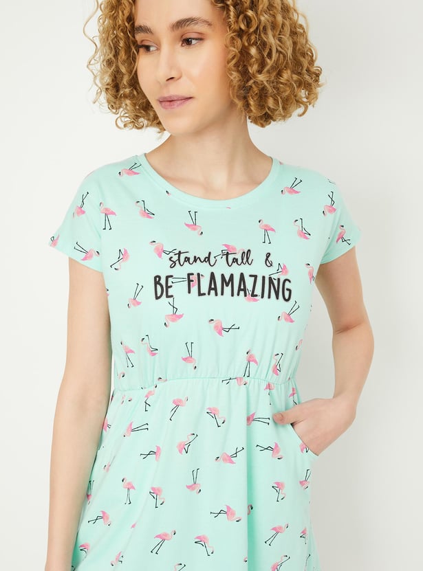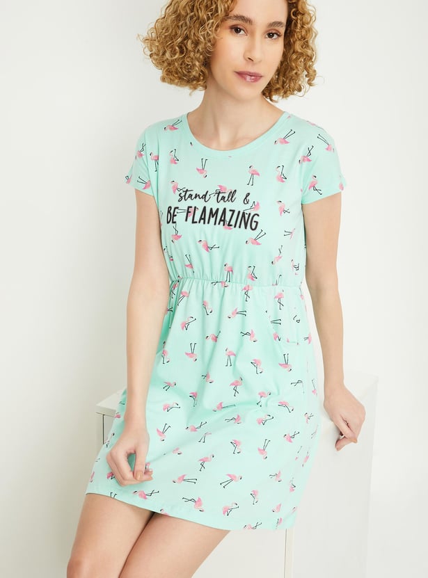 Relax and chill at your home with this chemise featuring a round neck, short sleeves, pockets and a printed design all over.