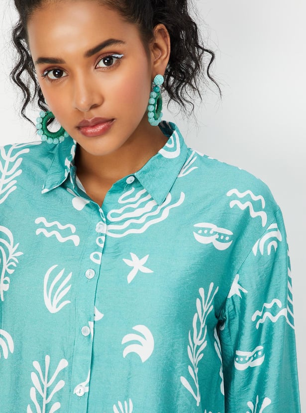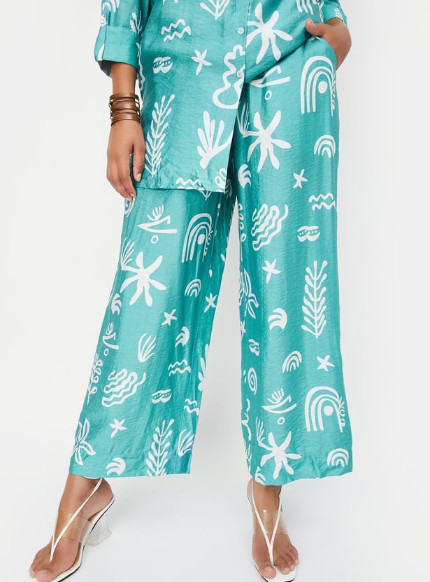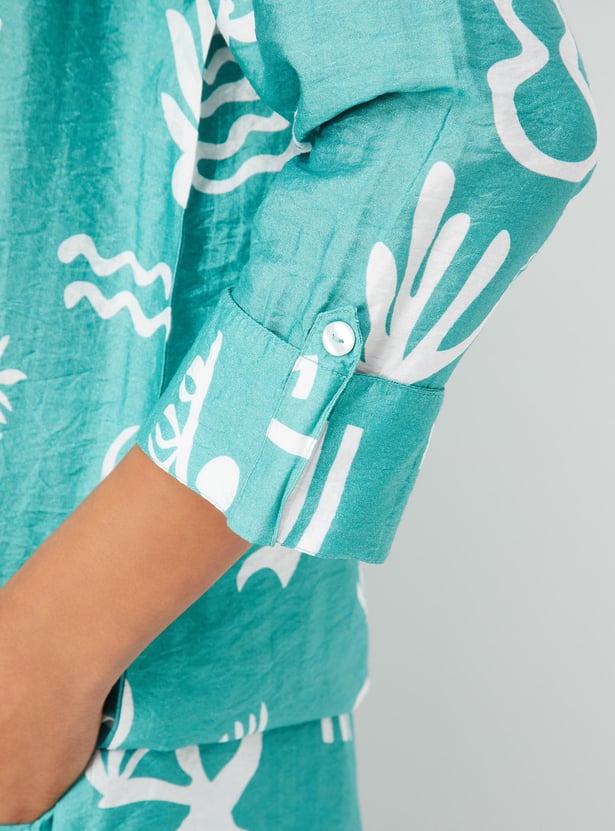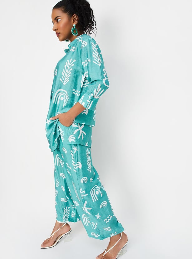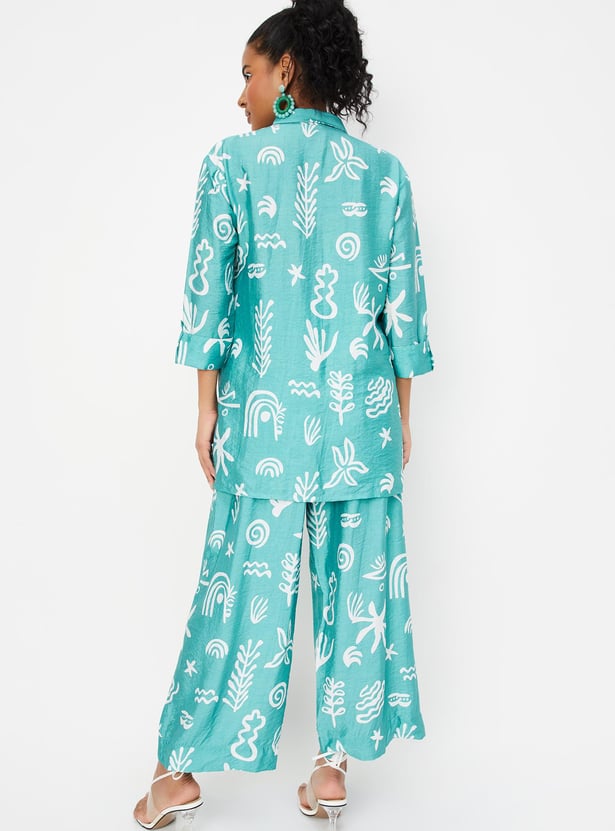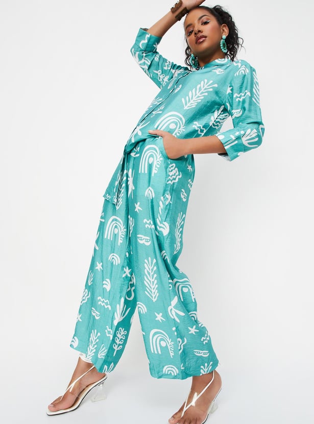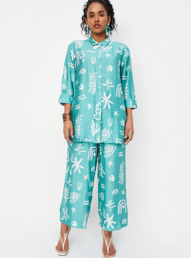 Paint your day in vibrant tones with this co-ord set featuring striking prints. It includes a shirt with a spread collar, three-quarter sleeves with tabs at the cuffs, and a front button placket. The pair of matching palazzos is styled with a partially elasticated waist, side pockets, and a wide-leg profile.