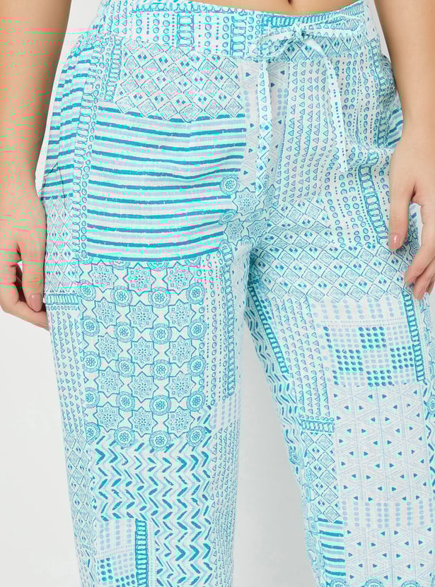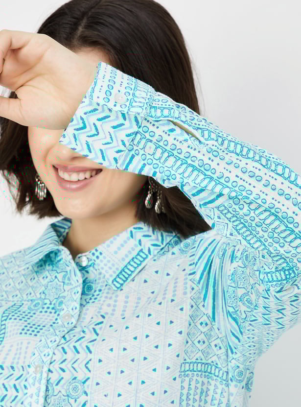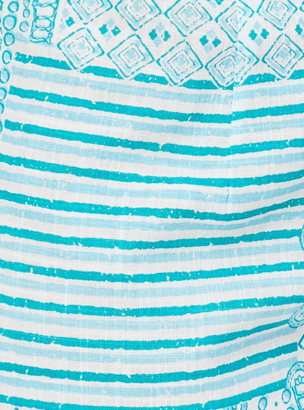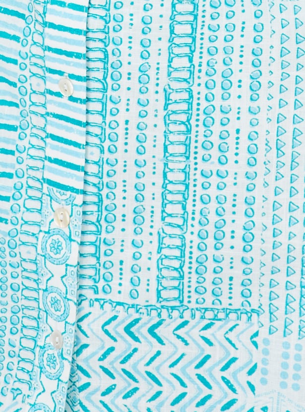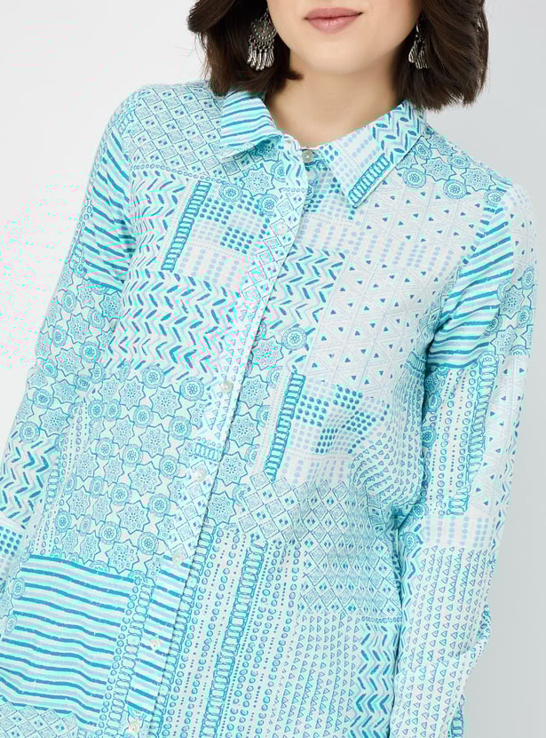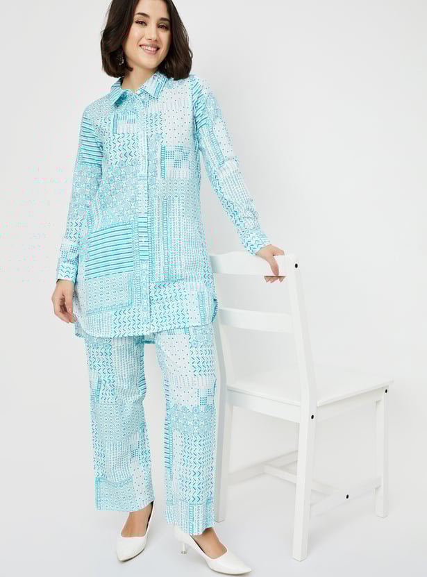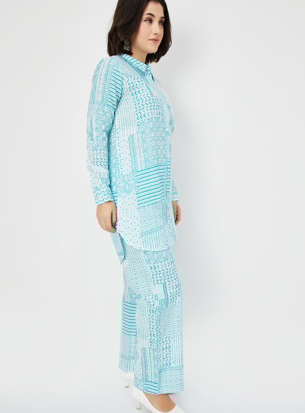 Elevate your style with this embroidered co-ords set. The tunic features a spread collar, full sleeves with button cuffs, button placket, and a flattering curved hem, while the matching trousers with an elasticated waist provide comfort and ease.