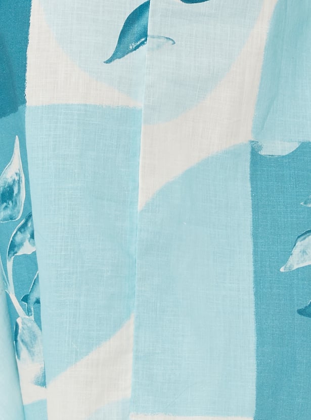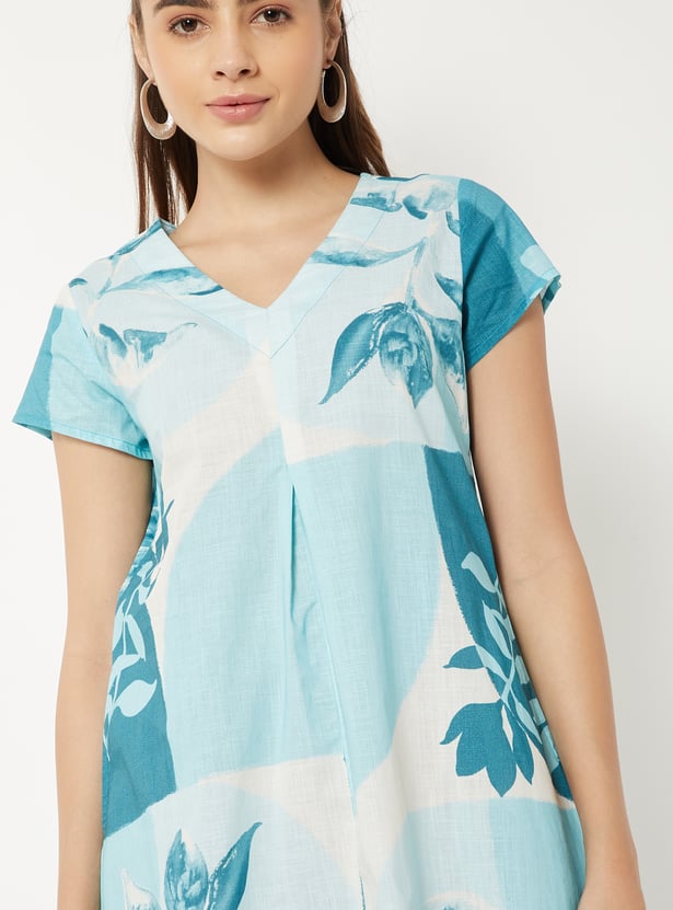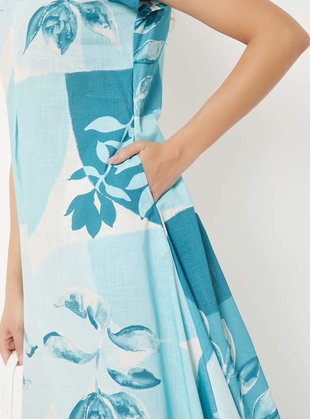 Embrace effortless elegance with this printed dress, designed with a flattering V-neck and comfortable half sleeves. Featuring an inverted pleat at the front for added movement and shape, along with practical waist pockets, it blends style with functionality. The flowing handkerchief hem and a graceful midi length complete the look.