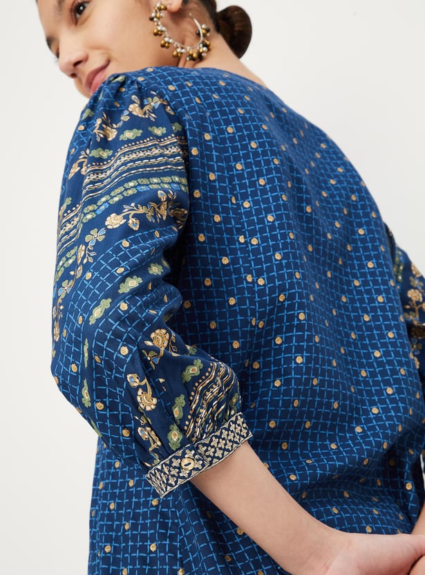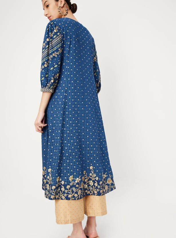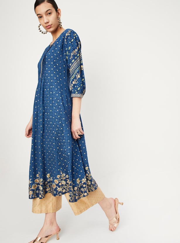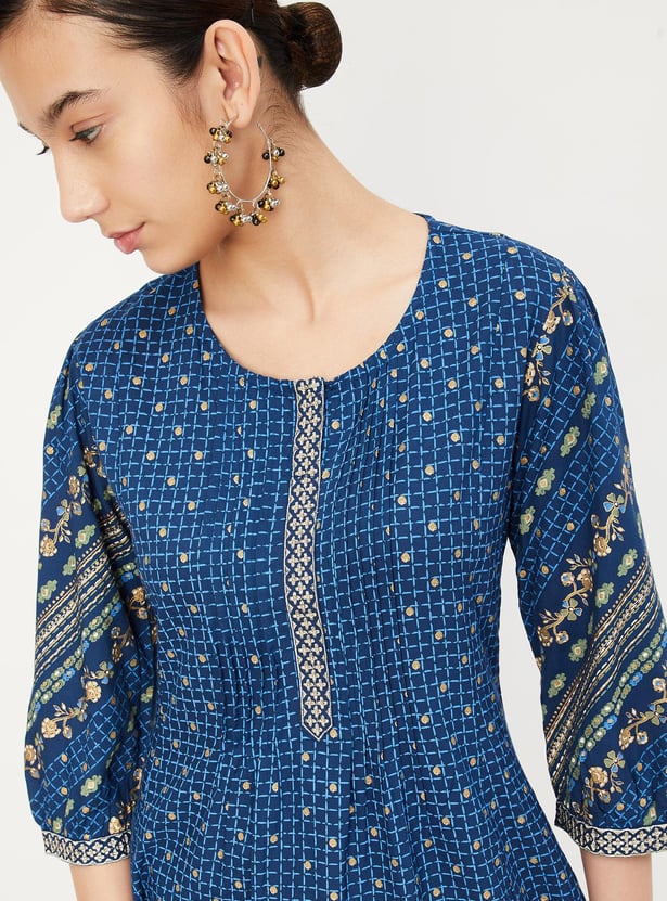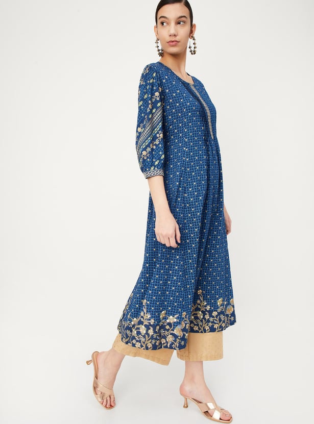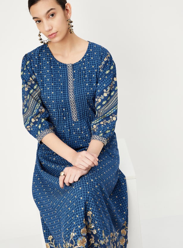Paint a picture of elegance in this kalidar kurta. It has a round neck, three-quarter sleeves, and a calf-length profile. The mixed prints and gathered waist amp up the overall look.