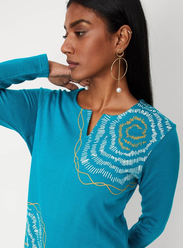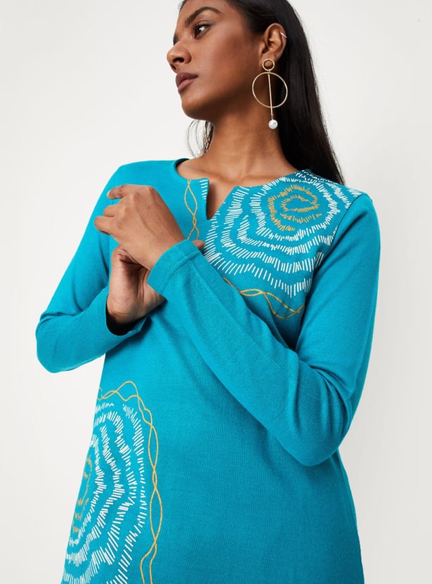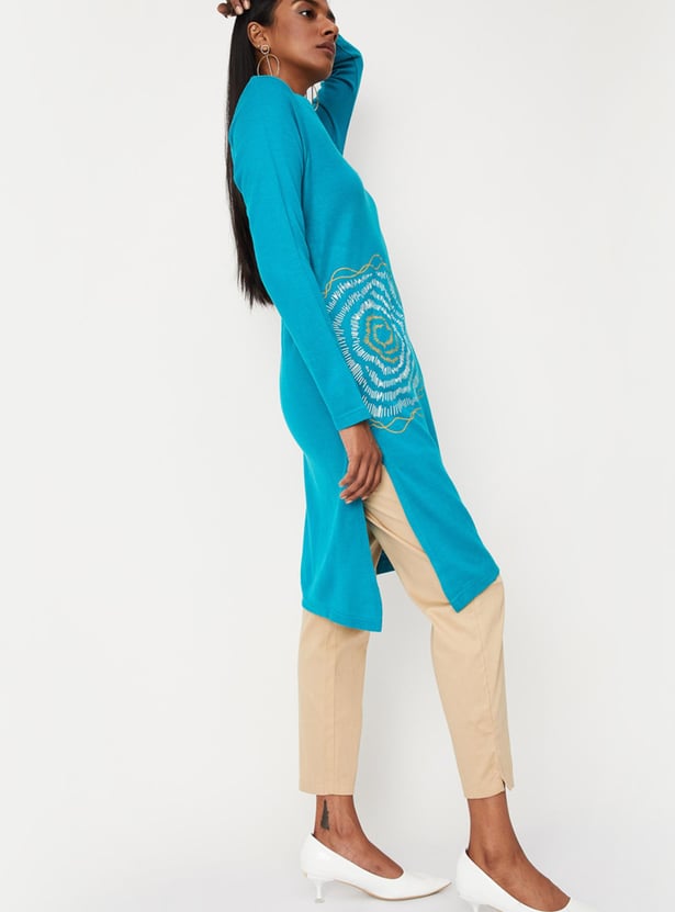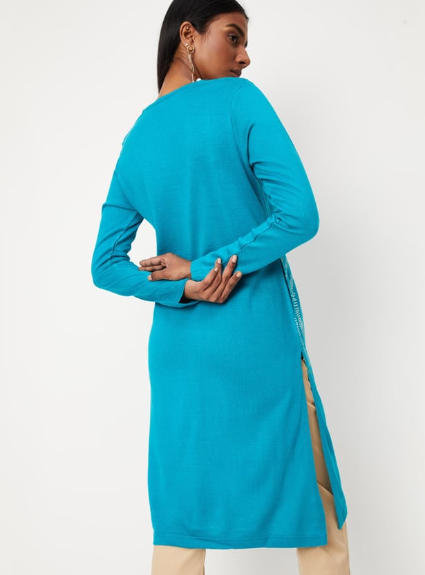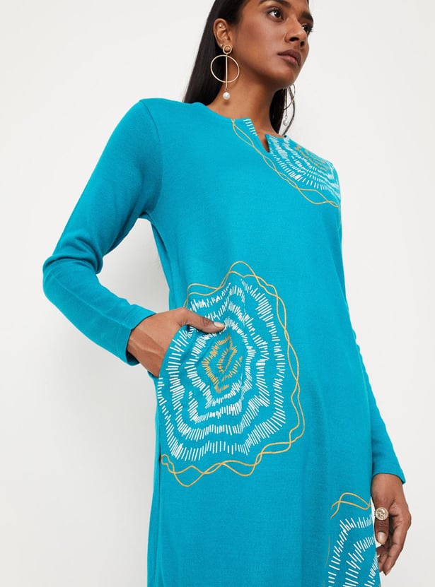 Cosy up for the winter in style with this straight kurta. It features a notched neck, long sleeves, and a side pocket. For an elegant work look, style this kurta with a pair of straight pants, block heels, and a tote bag.