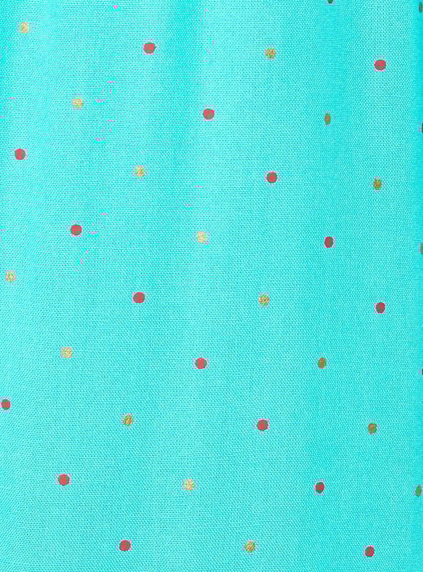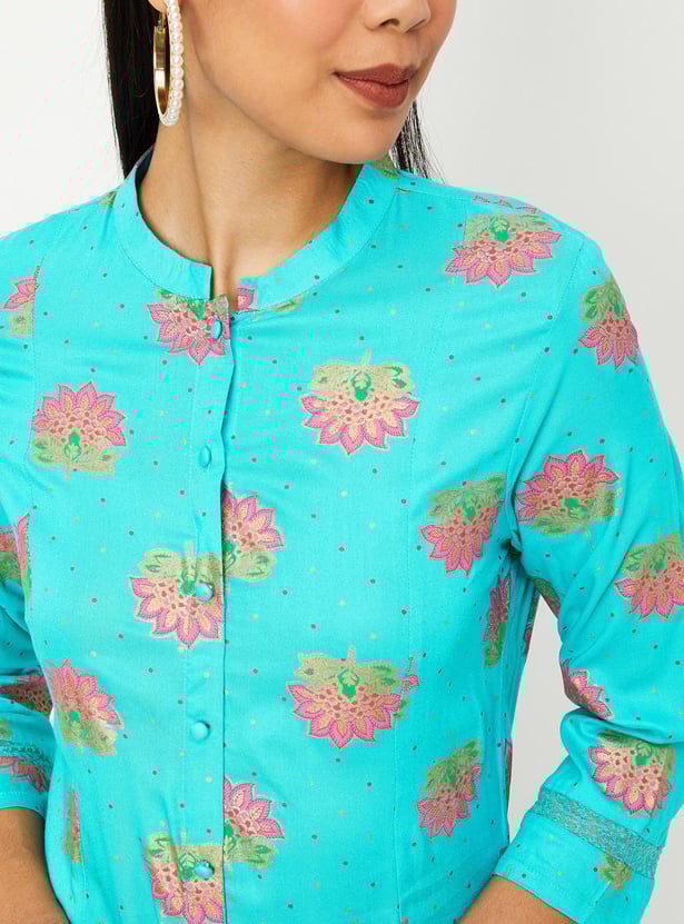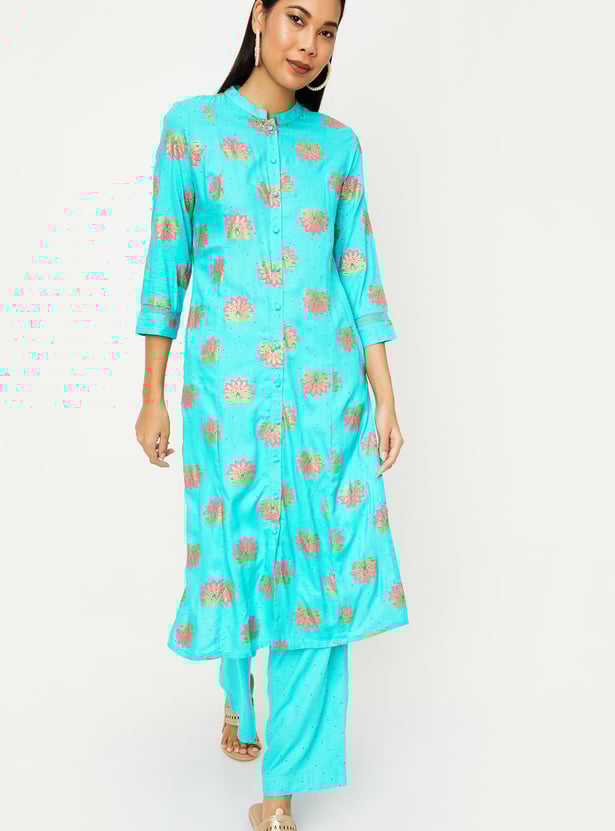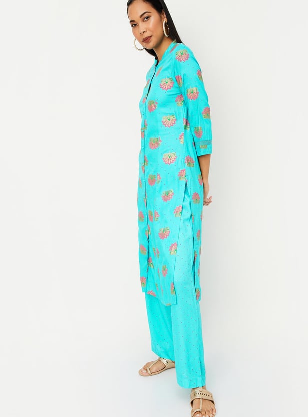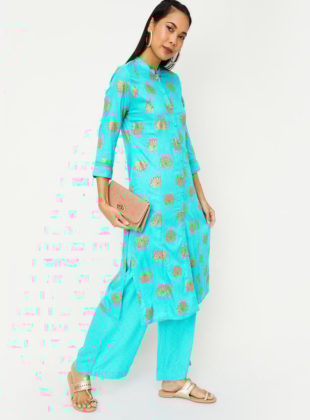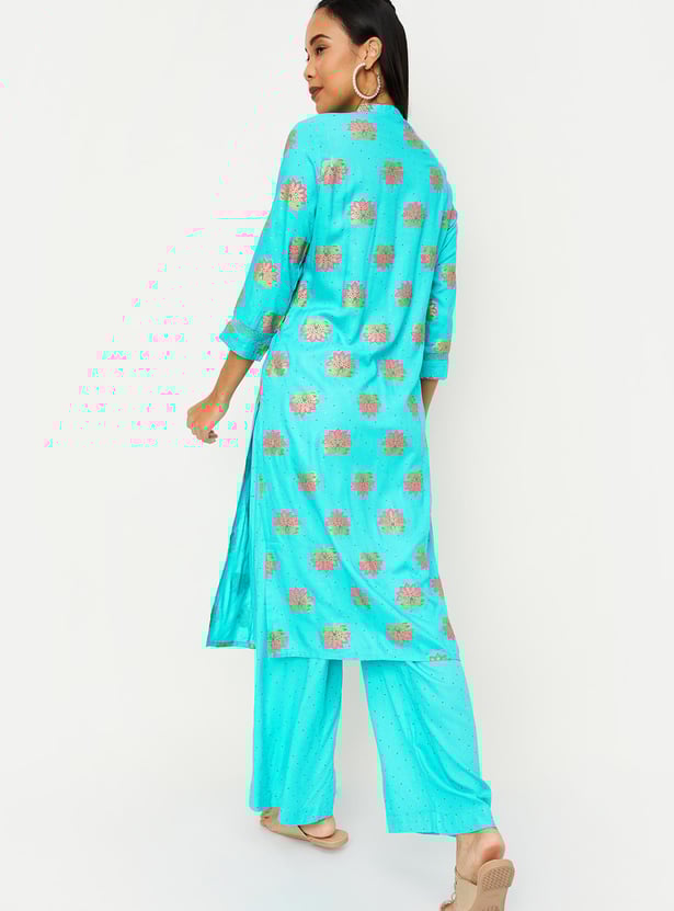 This printed kurta set with band collar, three-quarter sleeves, and knee-length construction that gives a touch of elegance. It comes with matching palazzos with elasticated waistband to complete your look.