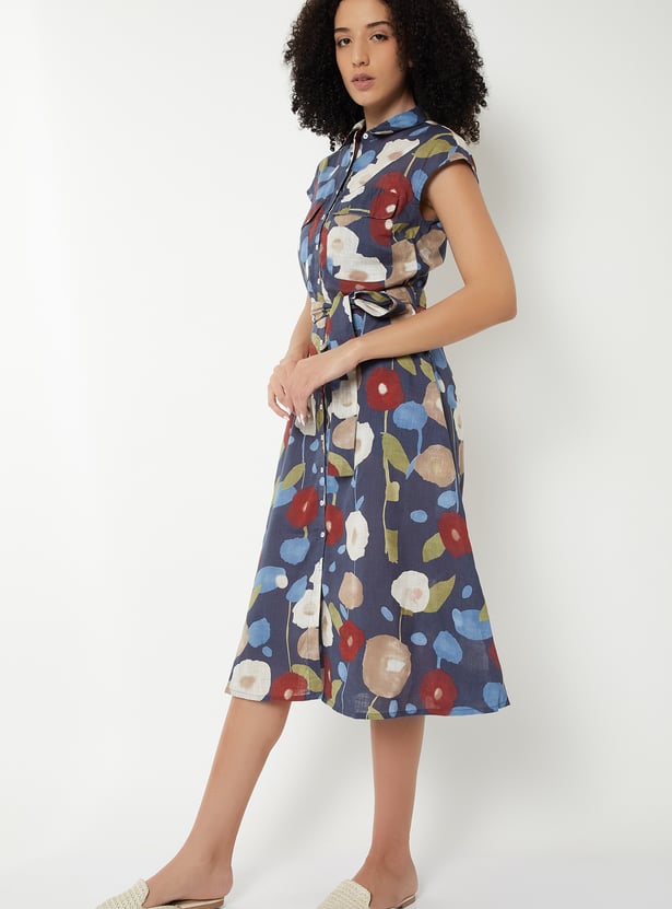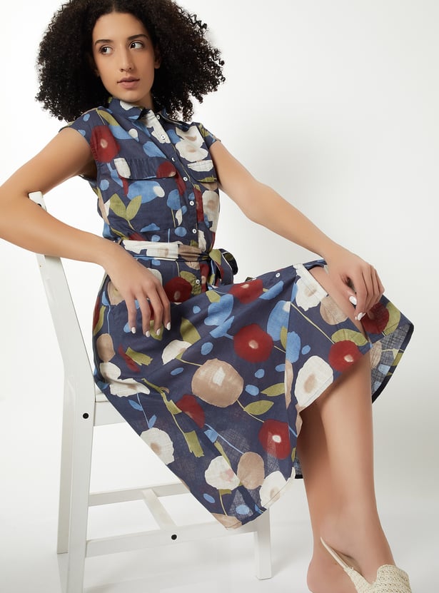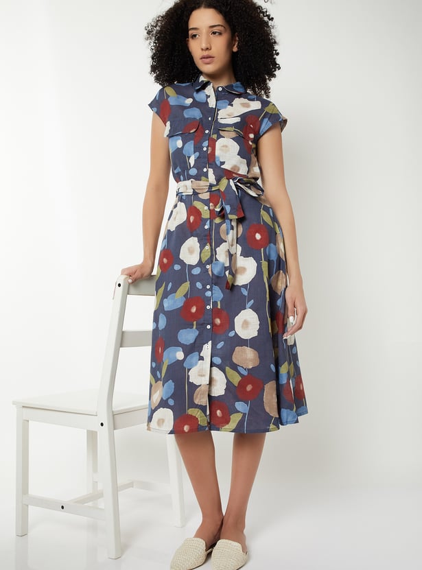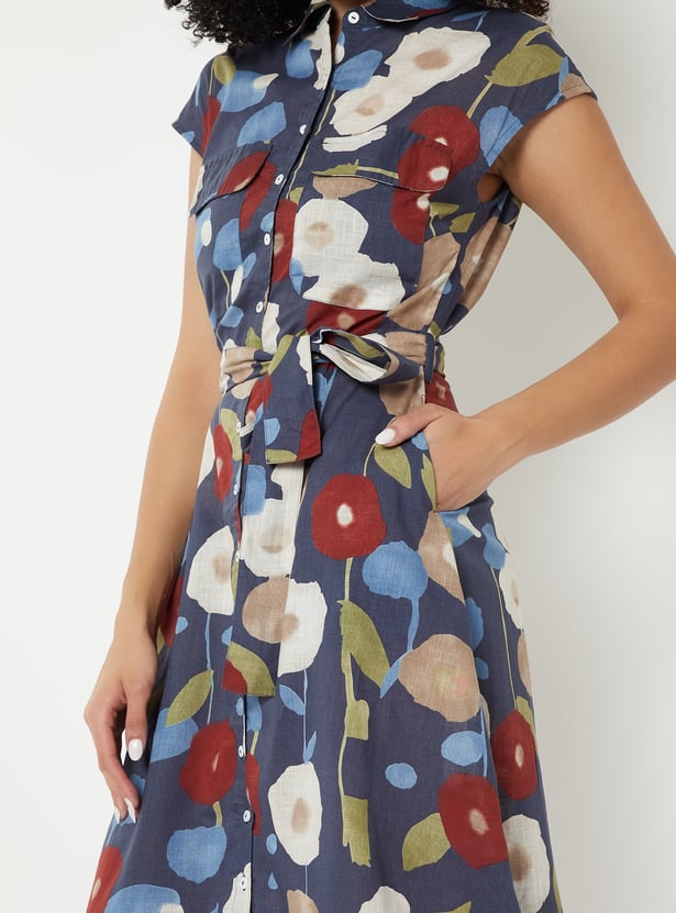 Step out in stylish elegance with this printed midi dress. Featuring a button placket, spread collar, flap pockets, cap sleeves, and a belted waist, it offers a flattering and polished look.