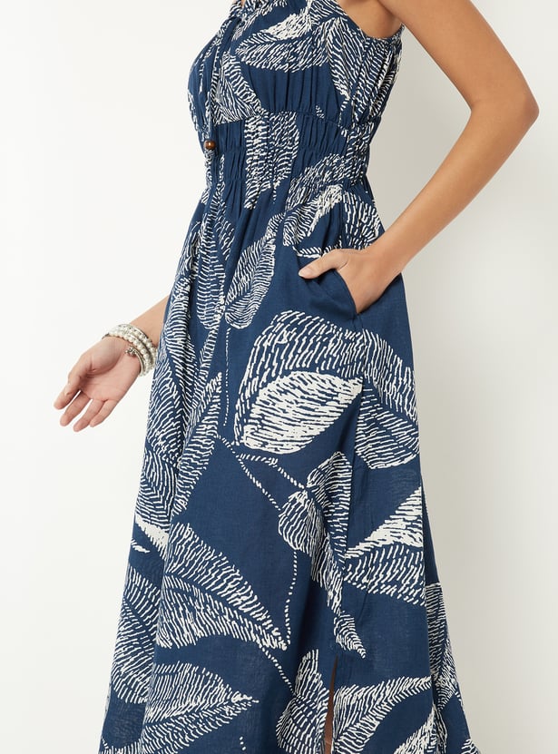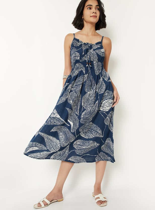 Step out in style with this printed midi dress, featuring a tie-up neckline, speghatti straps, smocked back, and convenient side pockets. Its flattering silhouette and feminine details make it a versatile choice for both casual outings and special occasions.